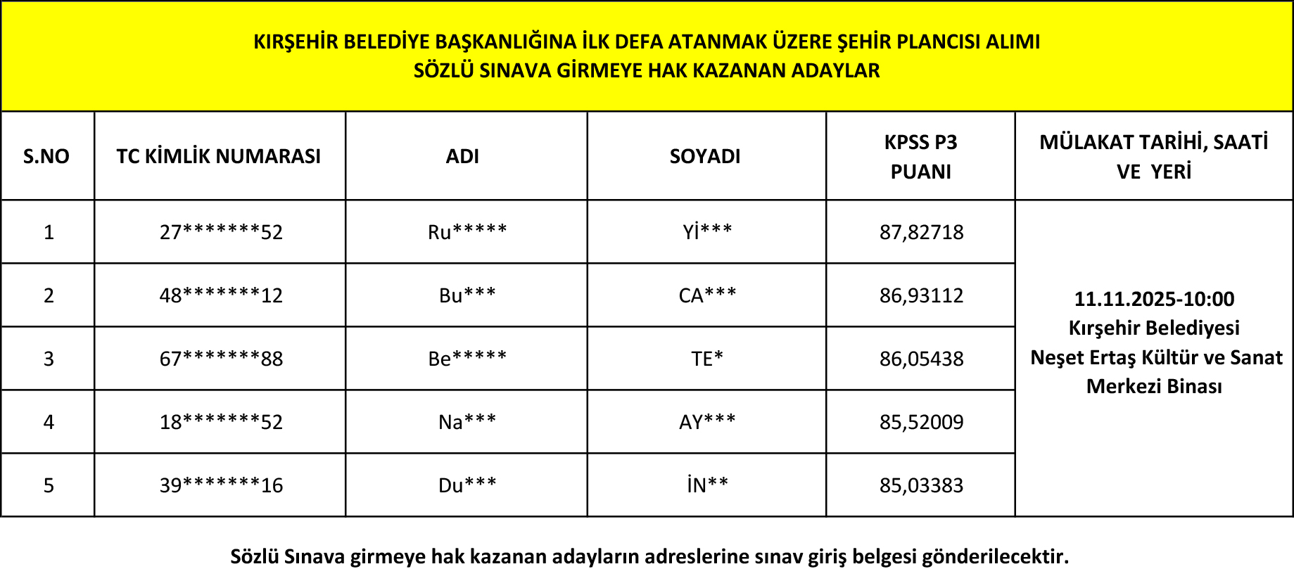 KIRŞEHİR BELEDİYE BAŞKANLIĞINA İLK DEFA ATANMAK ÜZERE ŞEHİR PLANCISI ALIMI SÖZLÜ SINAVA GİRMEYE HAK KAZANAN ADAYLAR!