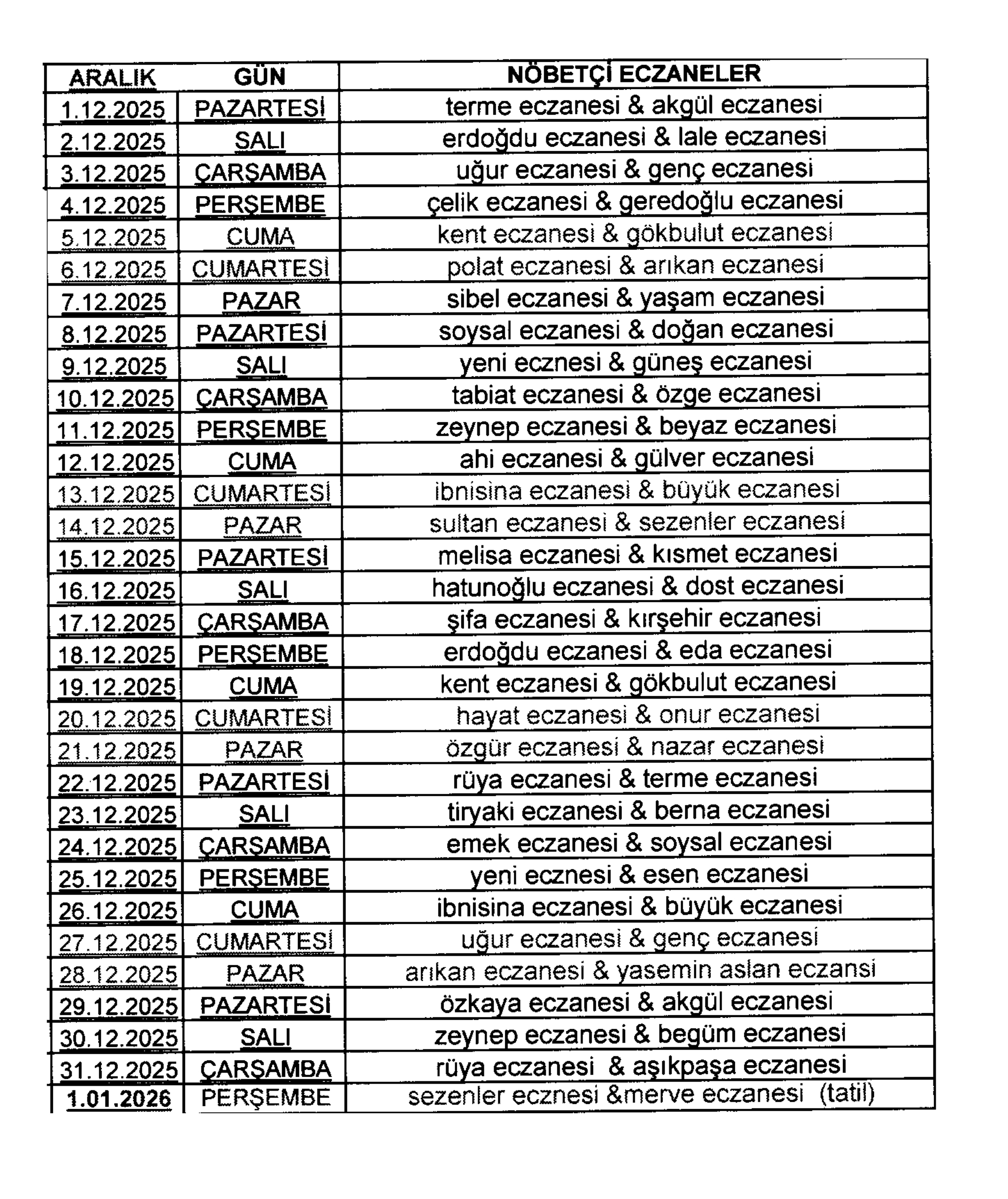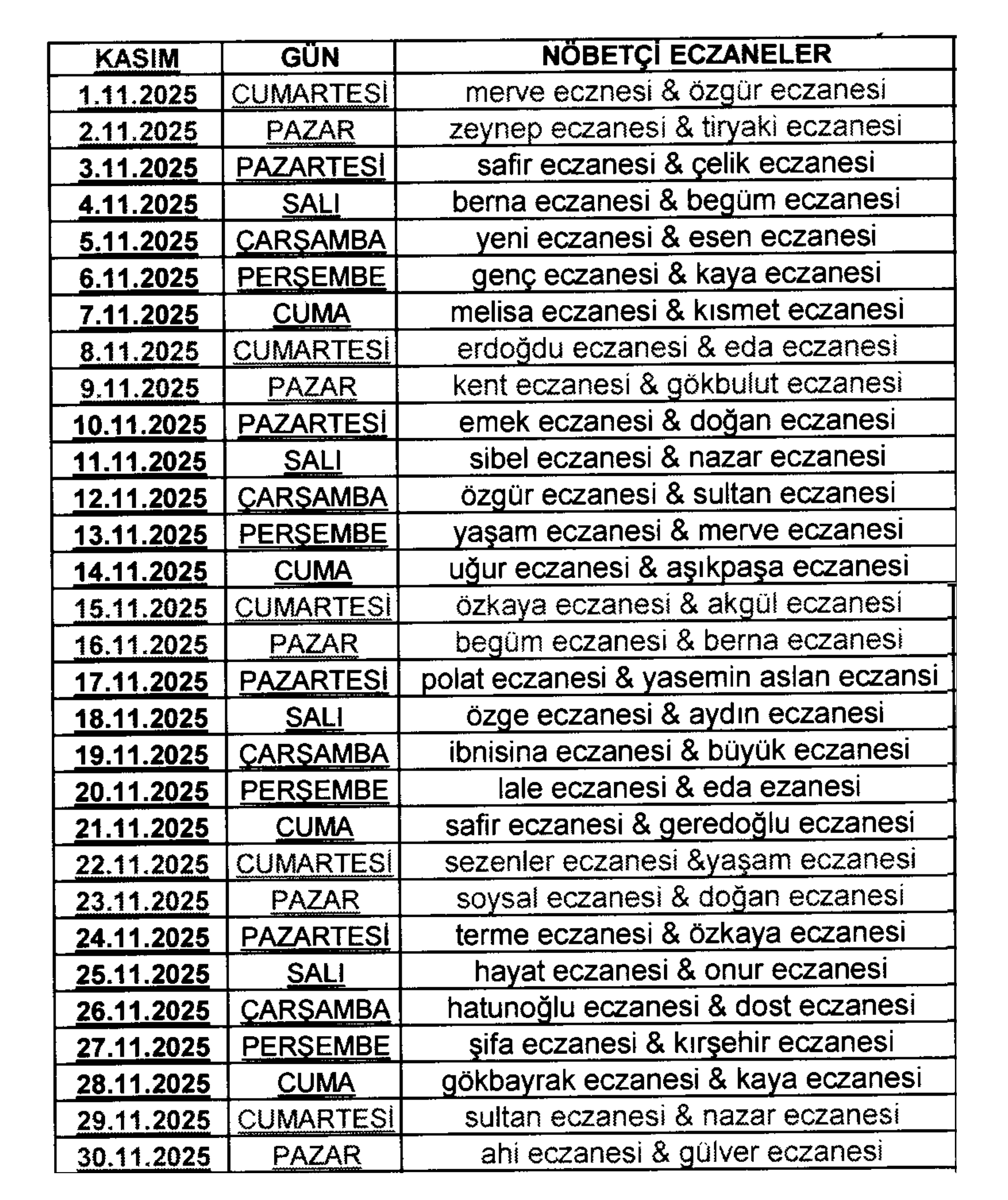 KASIM VE ARALIK AYI NÖBETÇİ ECZANELER