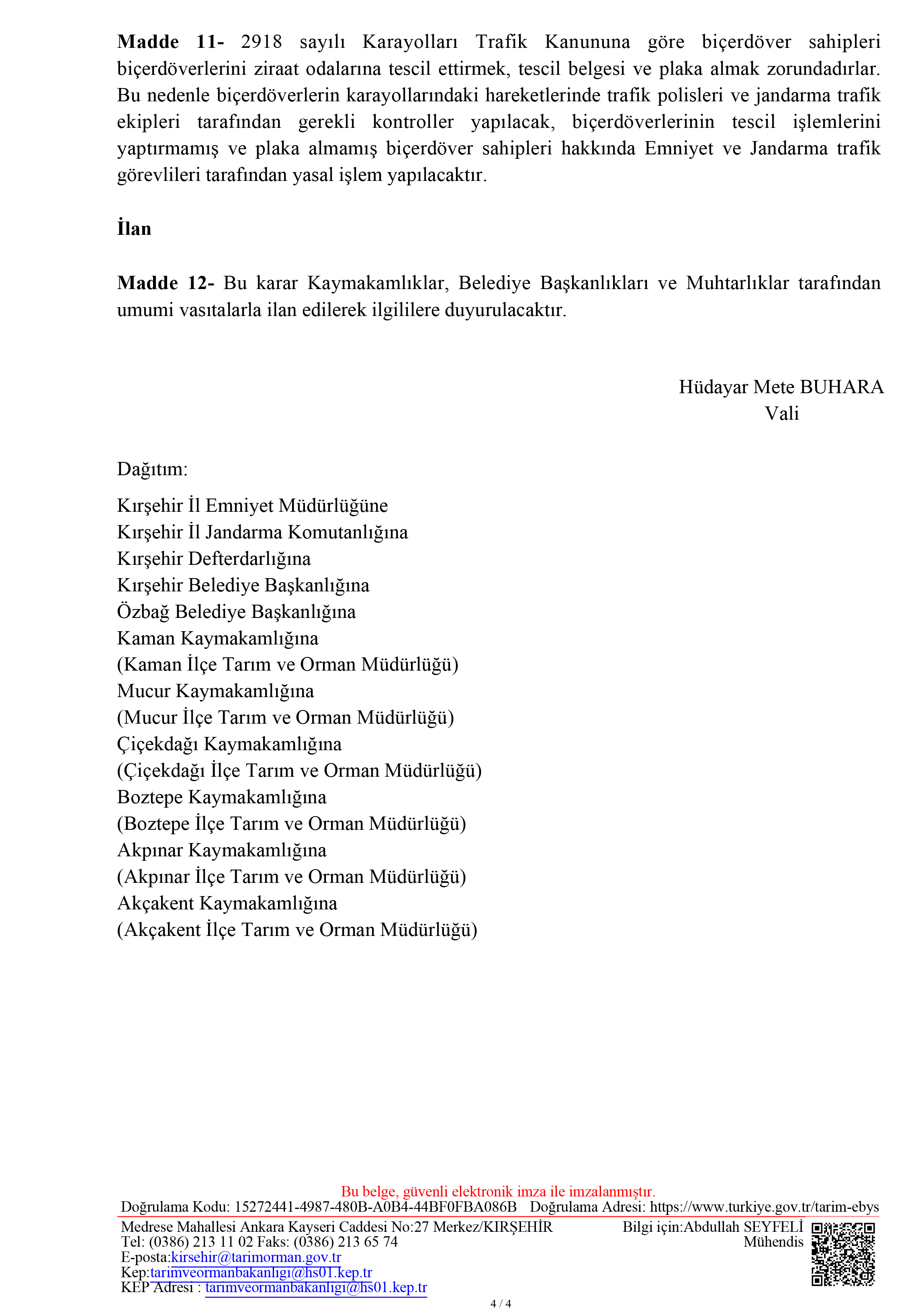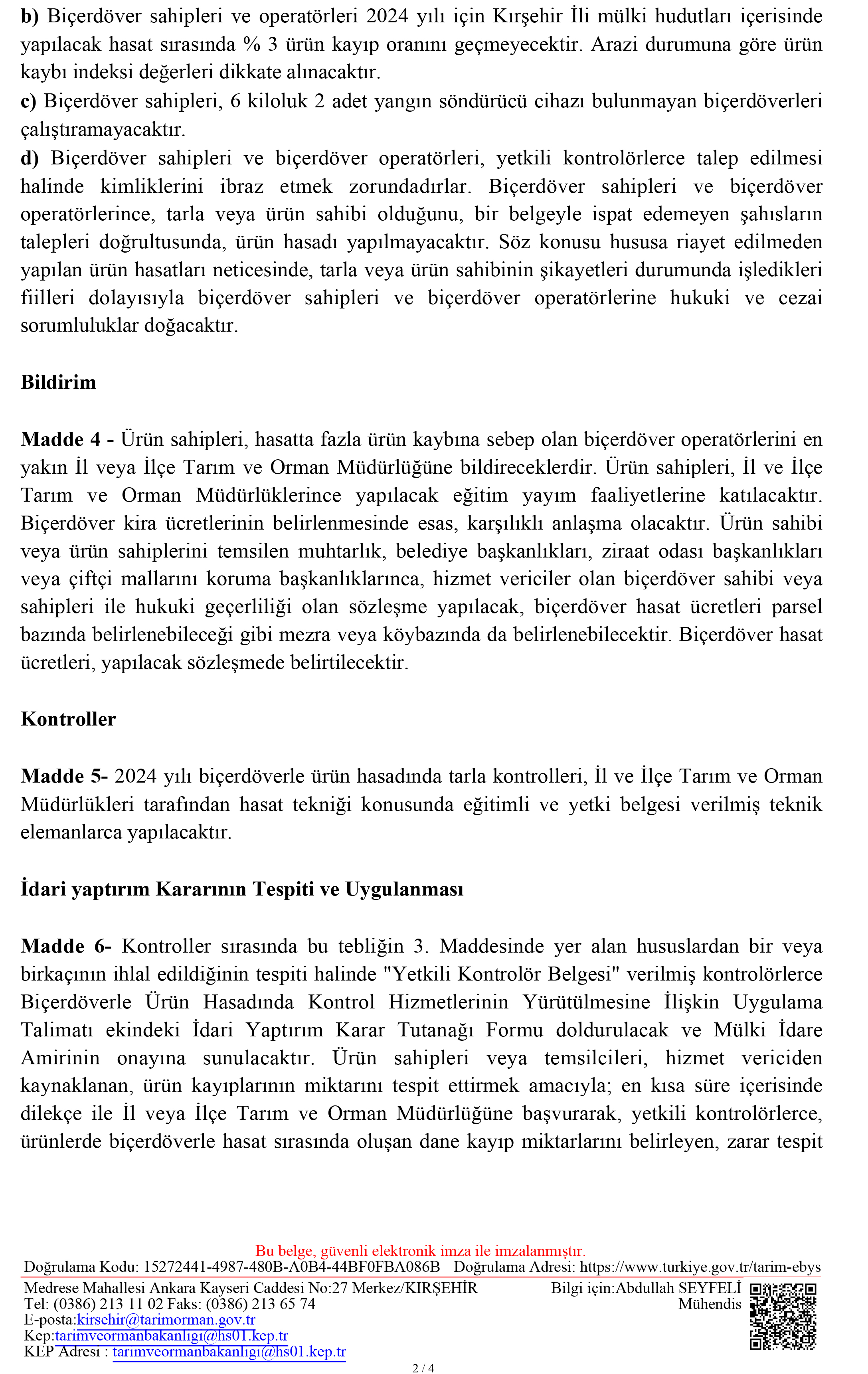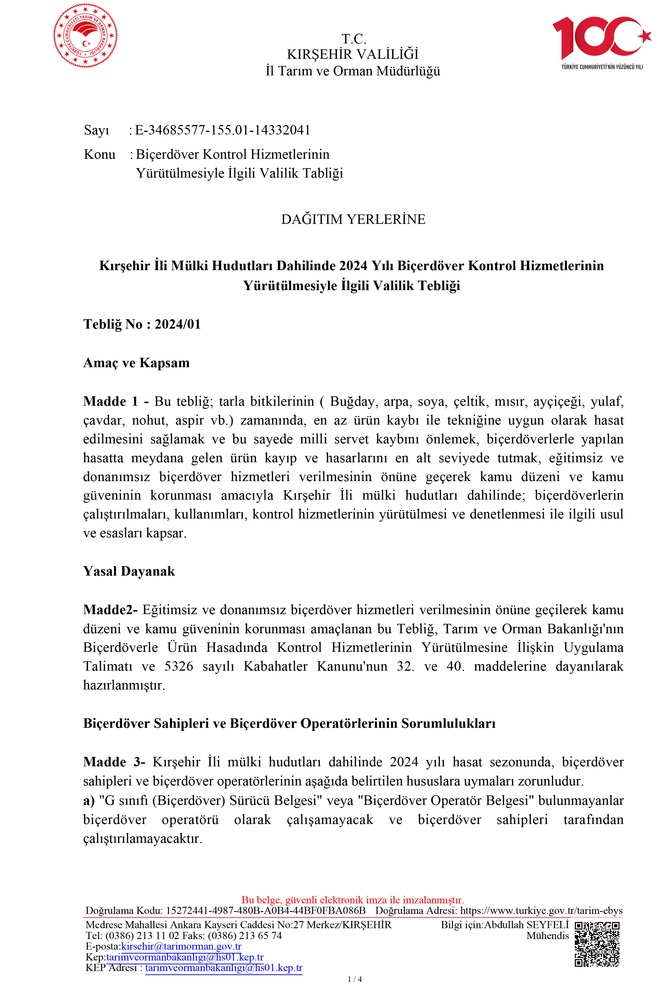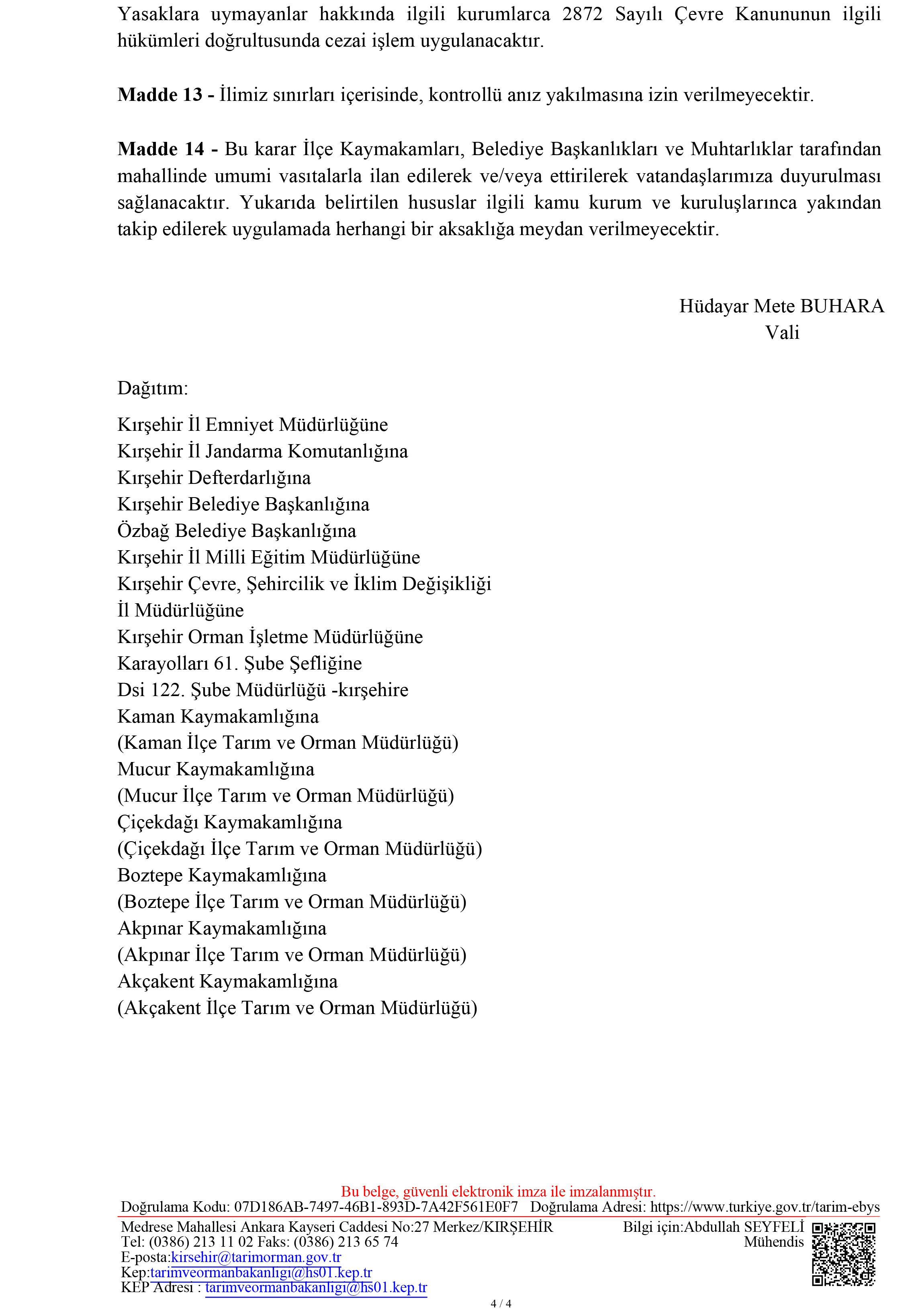 BİÇERDÖVER KONTROL HİZMETLERİNİN YÜRÜTÜLMESİYLE İLGİLİ VALİLİK TEBLİĞİ