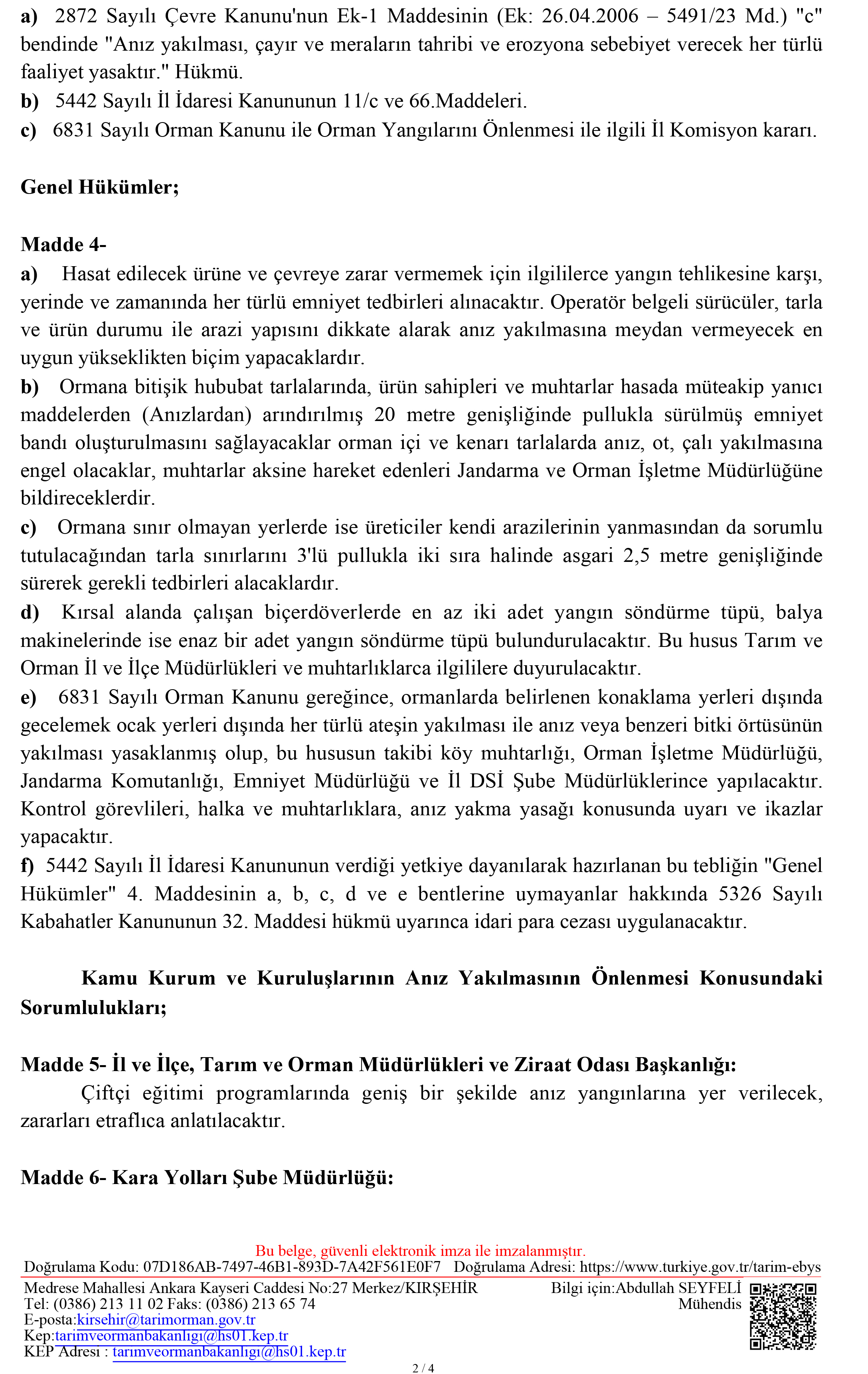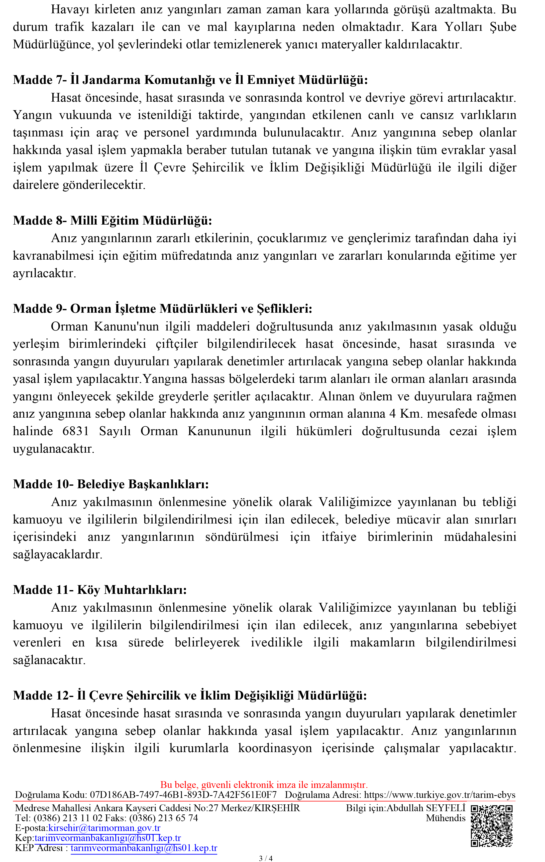 ANIZ YANGINLARININ ÖNLENMESİNE YÖNELİK VALİLİK TEBLİĞİ
