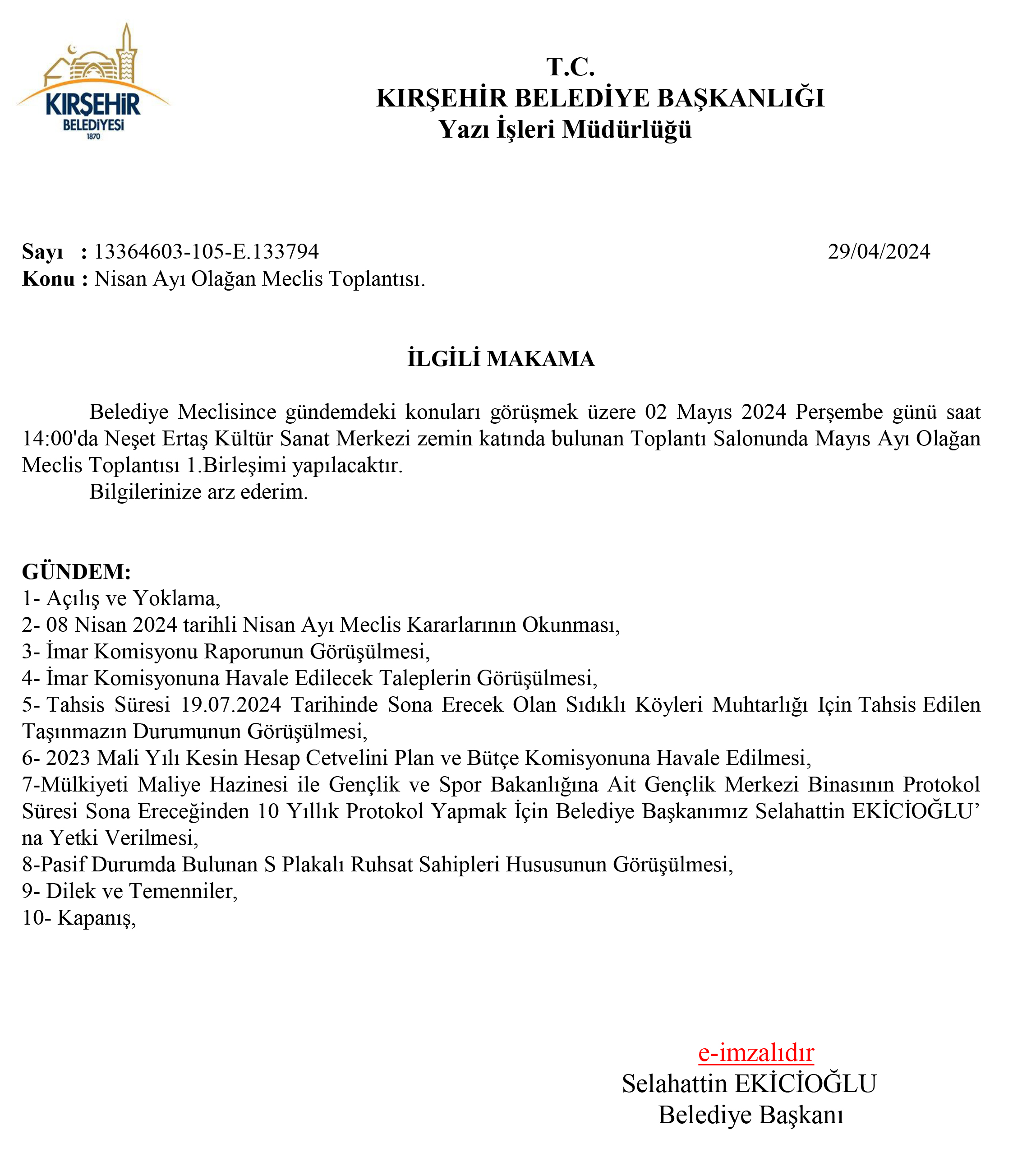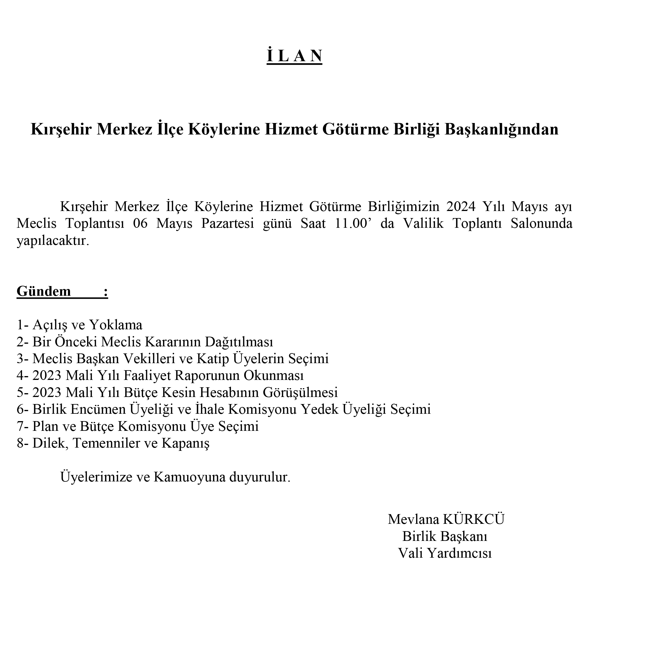 KIRŞEHİR VALİLİĞİ MERKEZ İLÇE KÖYLERİNE HİZMET GÖTÜRME BİRLİĞİ MECLİS TOPLANTISI