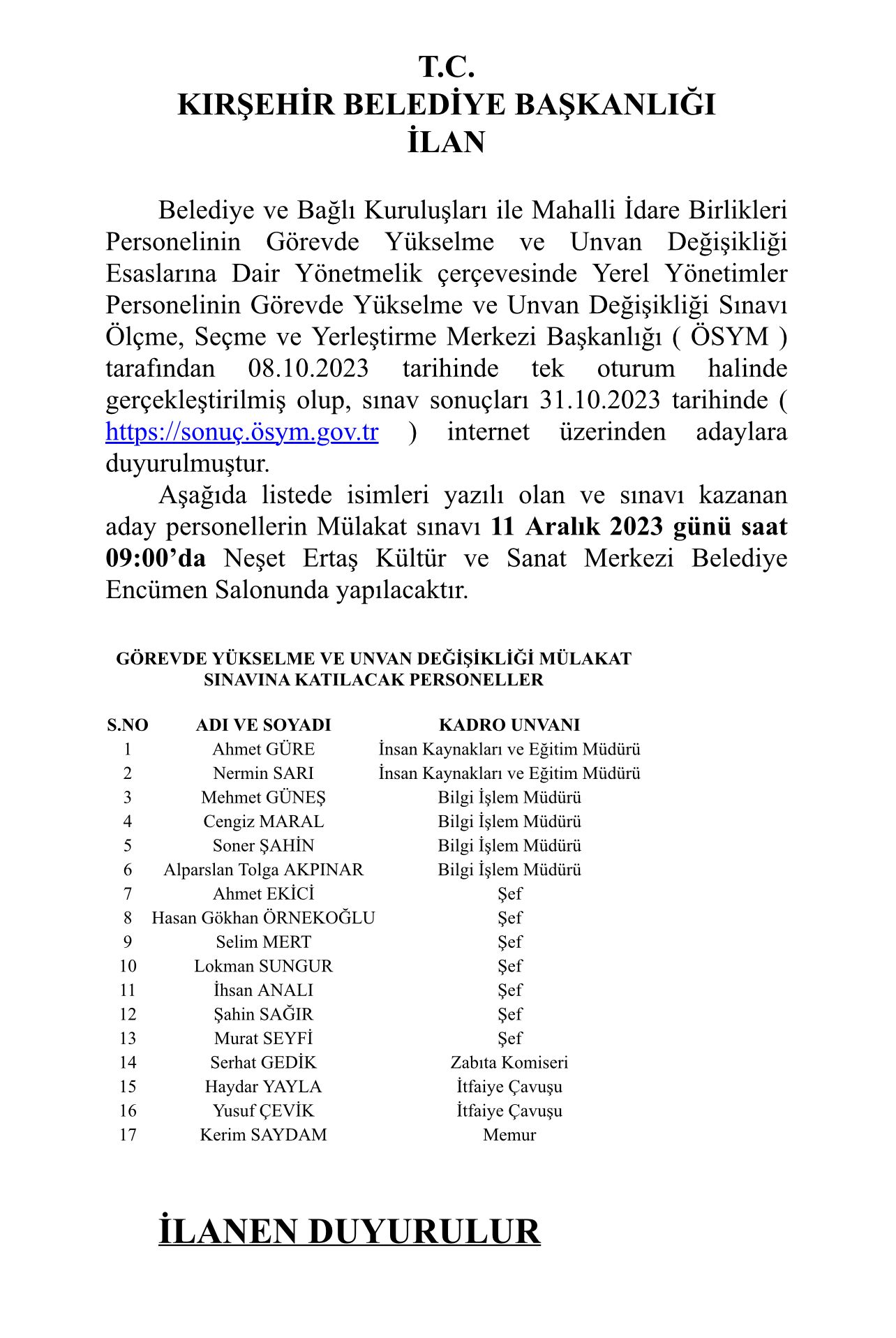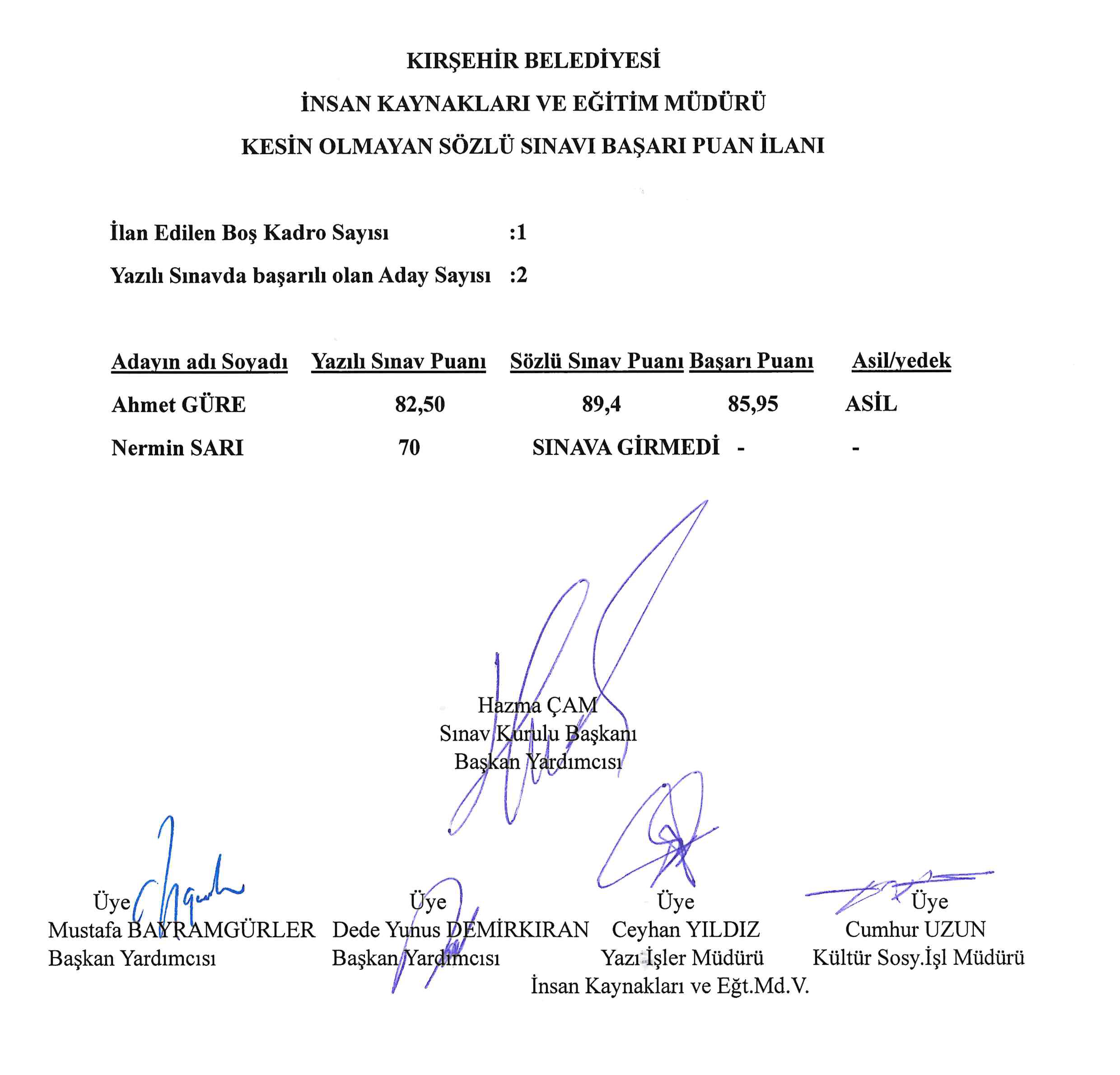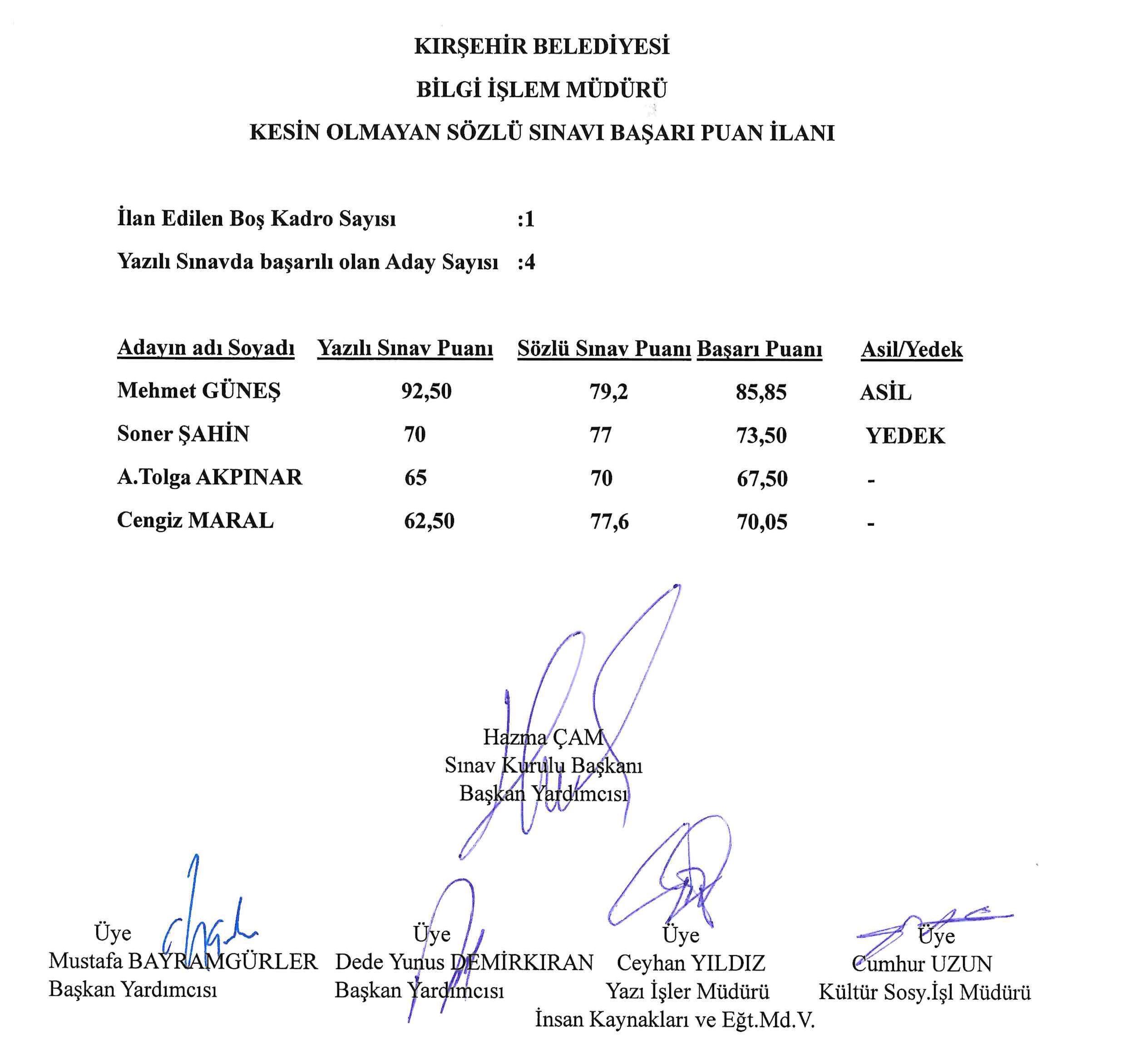 KIRŞEHİR BELEDİYESİ KESİN OLMAYAN SÖZLÜ SINAVI BAŞARI PUAN İLANI