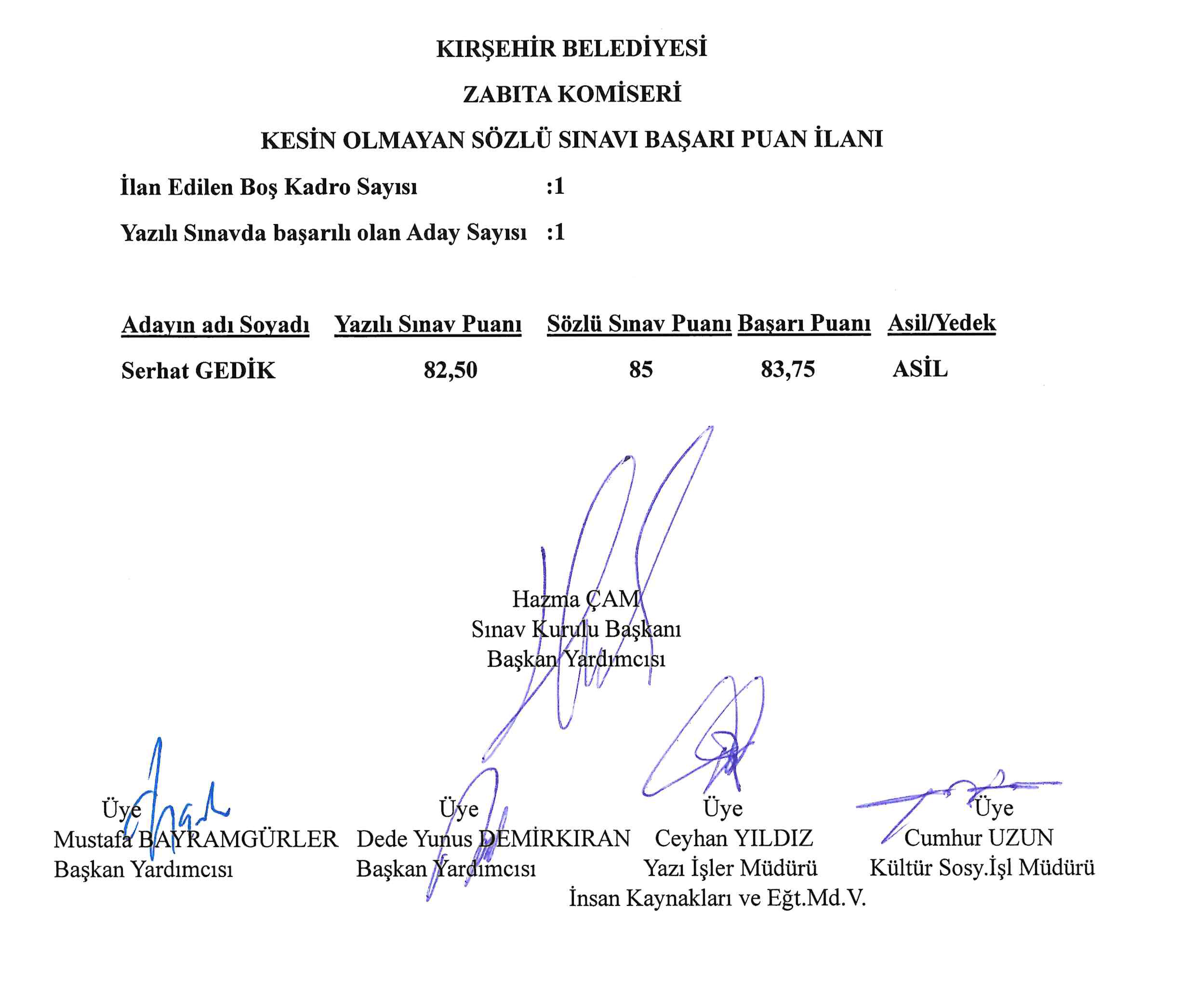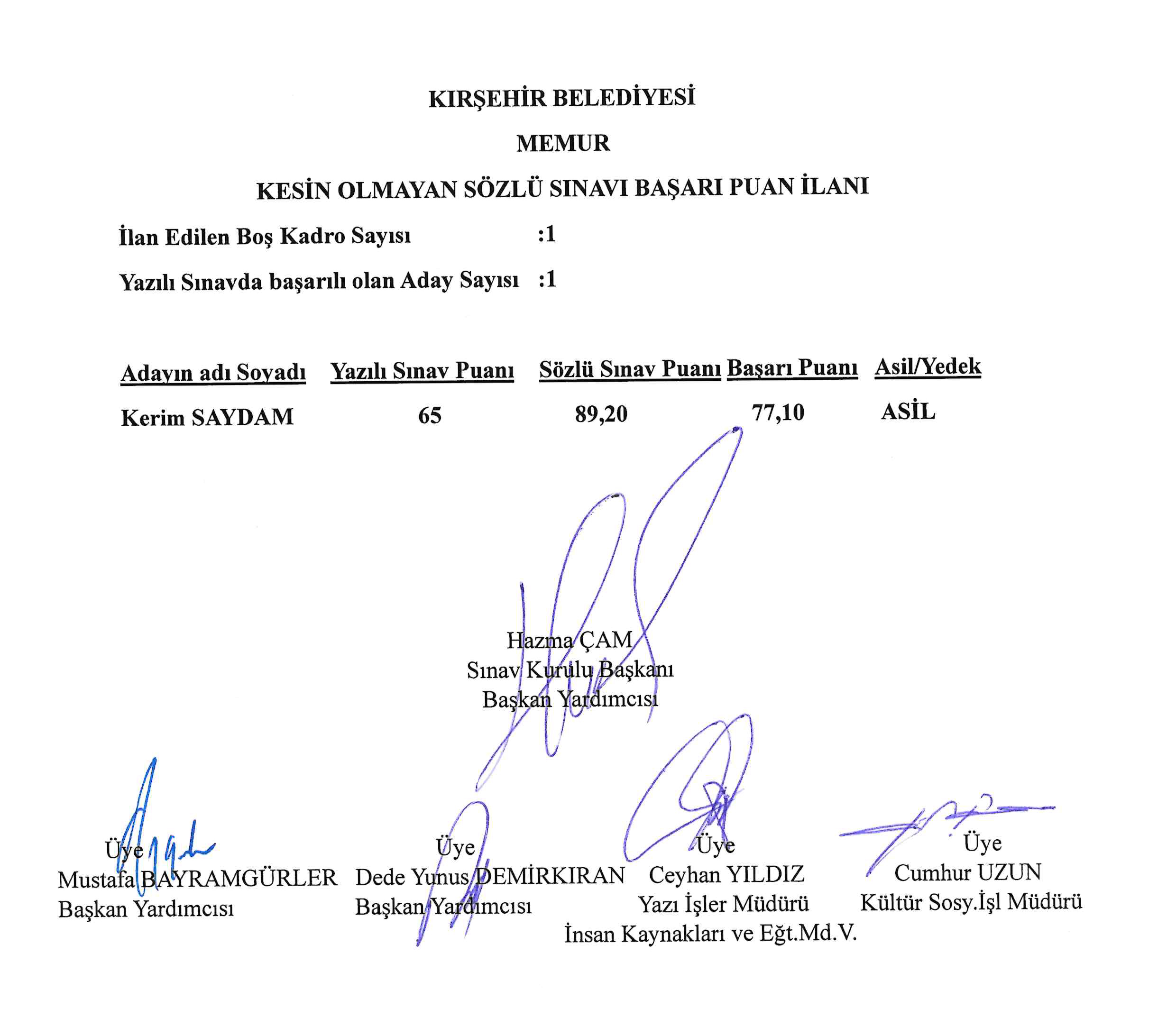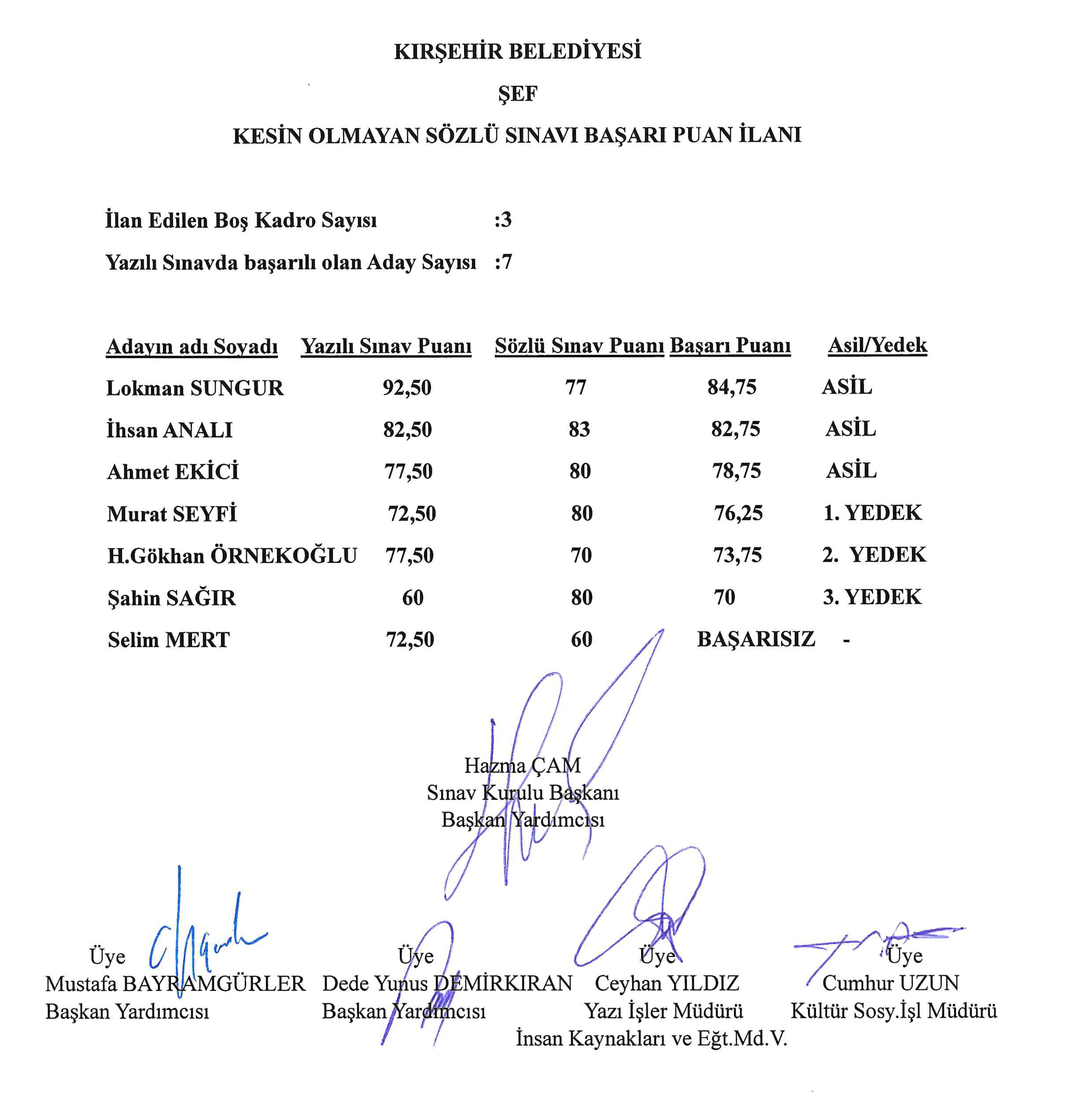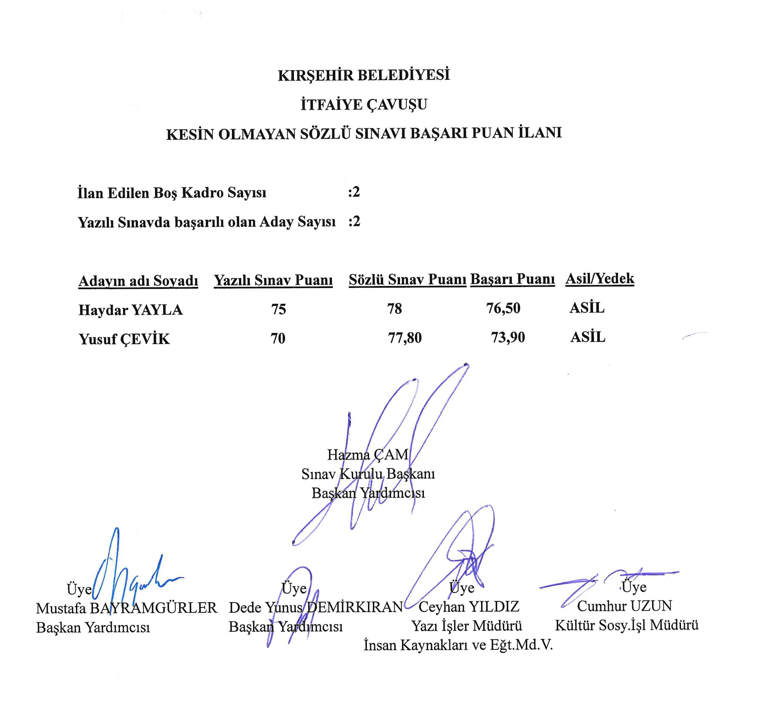 KIRŞEHİR BELEDİYESİ KESİN OLMAYAN SÖZLÜ SINAVI BAŞARI PUAN İLANI