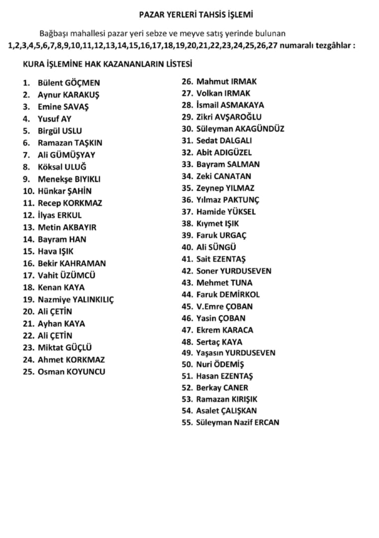 PAZAR YERLERİ TAHSİS İŞLEMİ (KURA İŞLEMİNE HAK KAZANANLARIN LİSTESİ)