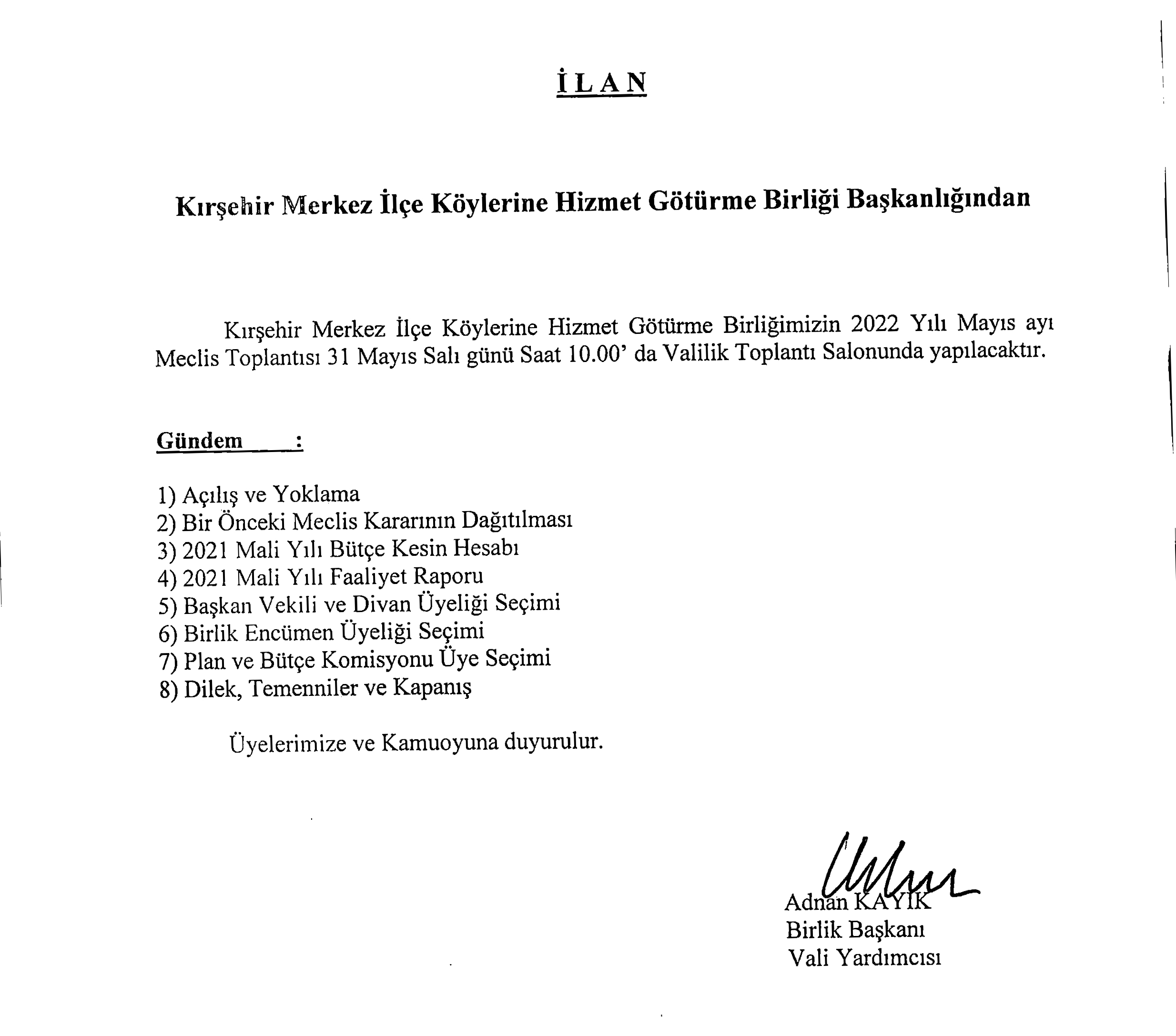 KIRŞEHİR VALİLİĞİ "KÖYLERE HİZMET GÖTÜRME BİRLİĞİ MECLİS TOPLANTISI" DUYURUSU