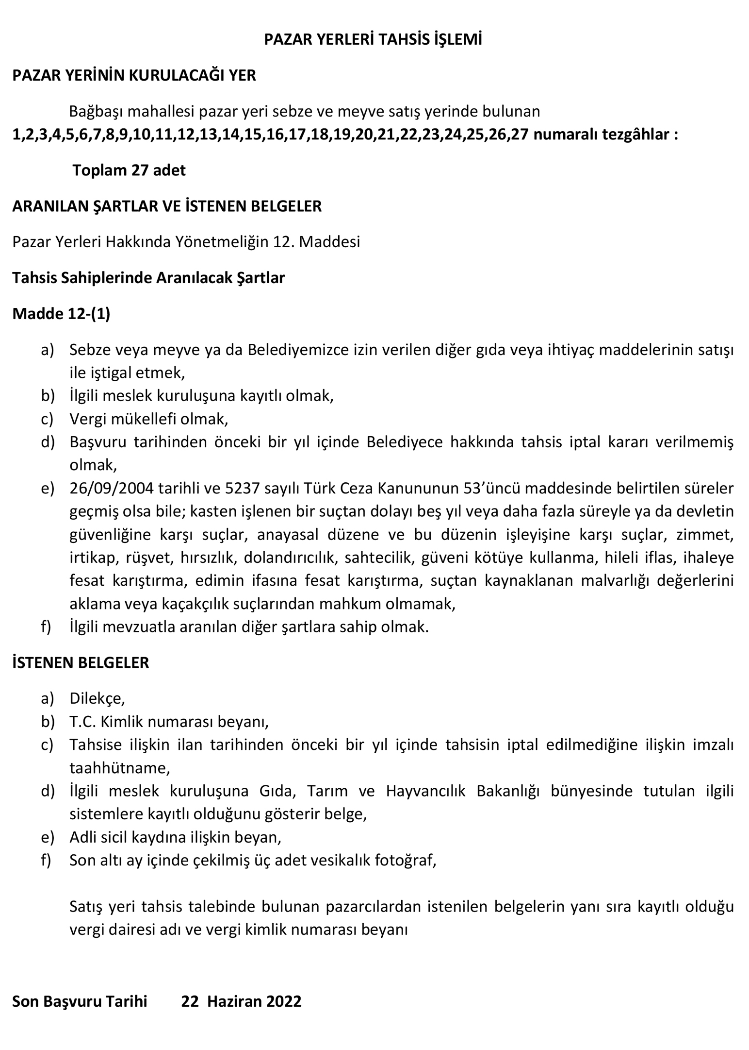 PAZAR YERİ TAHSİS İŞLEMİ (BAĞBAŞI MAHALLESİ)