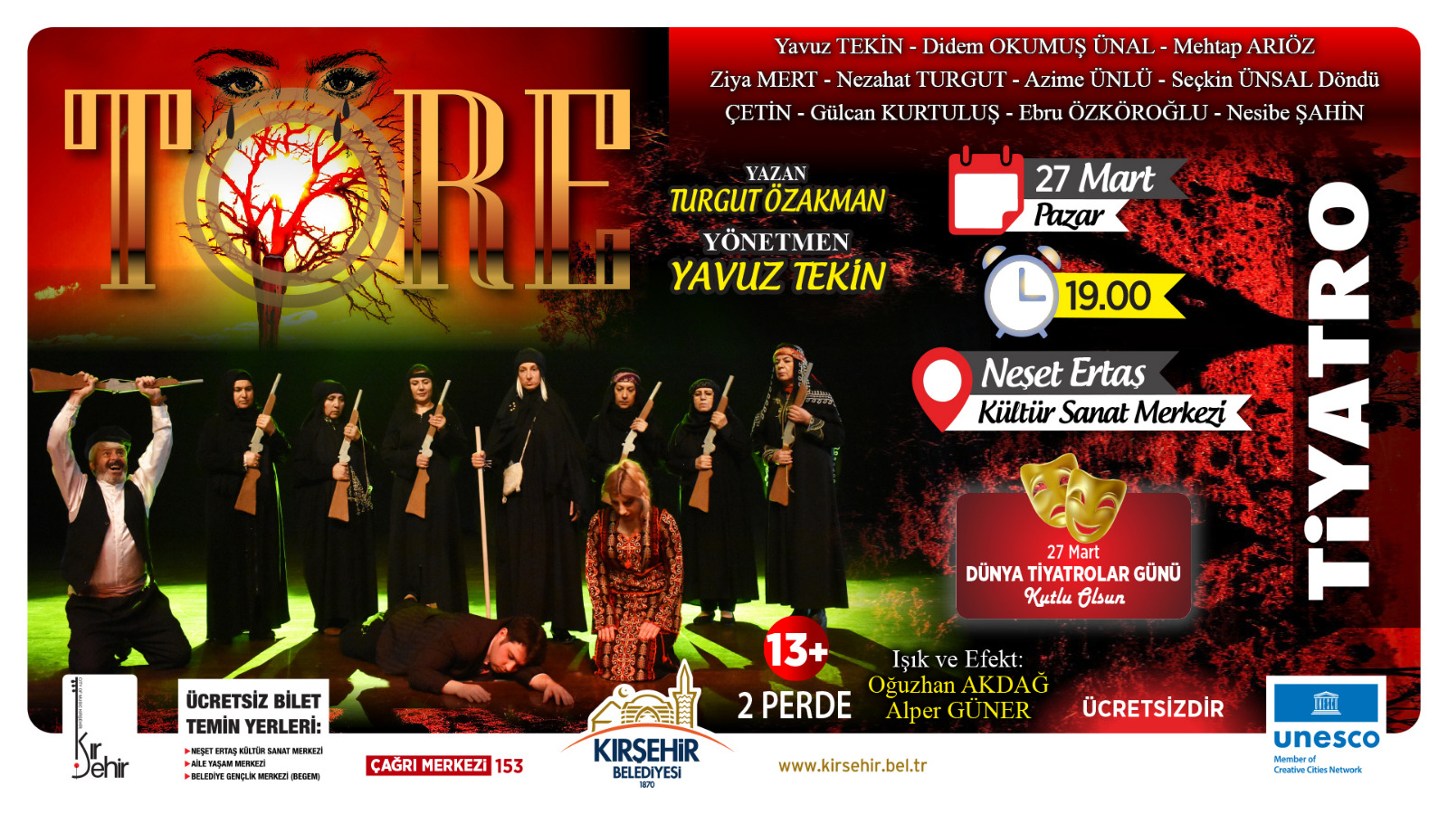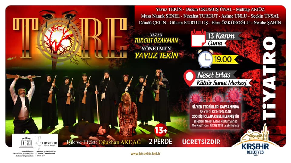 Belediyemiz tarafından düzenlenecek olan, Töre adlı oyunumuz 13 Kasım Cuma günü saat;19:00’da Neşet Ertaş Kültür Merkezi’nde sahnelenecektir.
