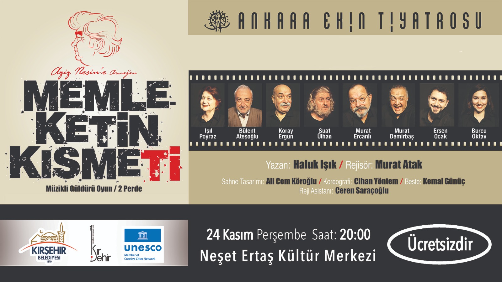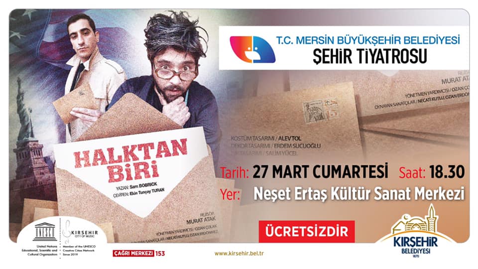 Neşet Ertaş Kültür Sanat Merkezi'nde, Mersin Büyükşehir Belediyesi Şehir Tiyatrosu "HALKTAN BİRİ" adlı oyununu sergileyecektir.