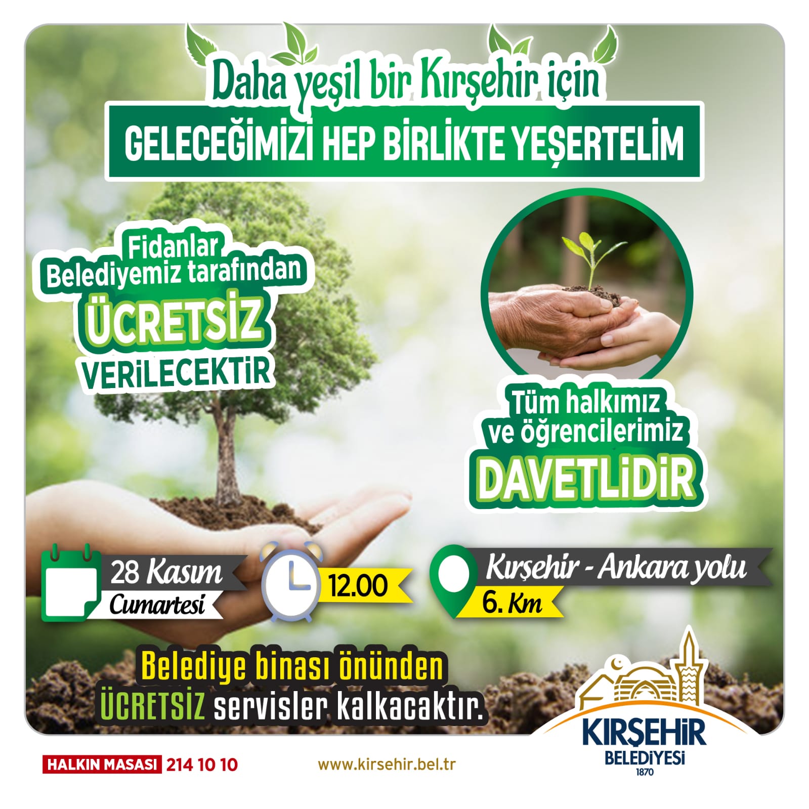 Daha yeşil bir Kırşehir için, Geleceğimizi hep birlikte yeşertelim... 28 Kasım Cumartesi günü saat : 12.00’ daki Ağaç dikme etkinliğimize tüm halkımızı bekliyoruz...