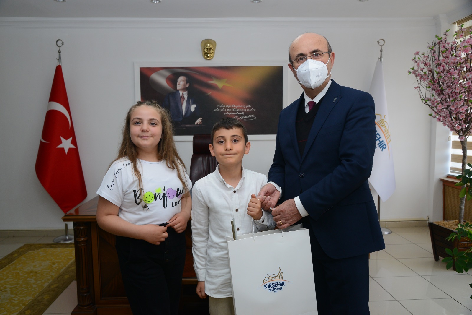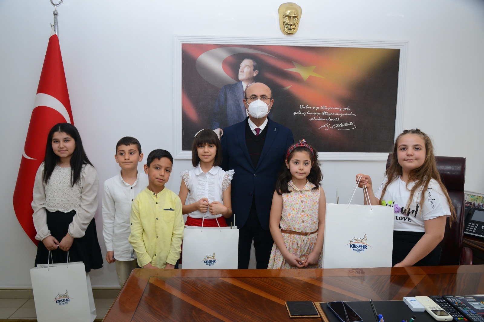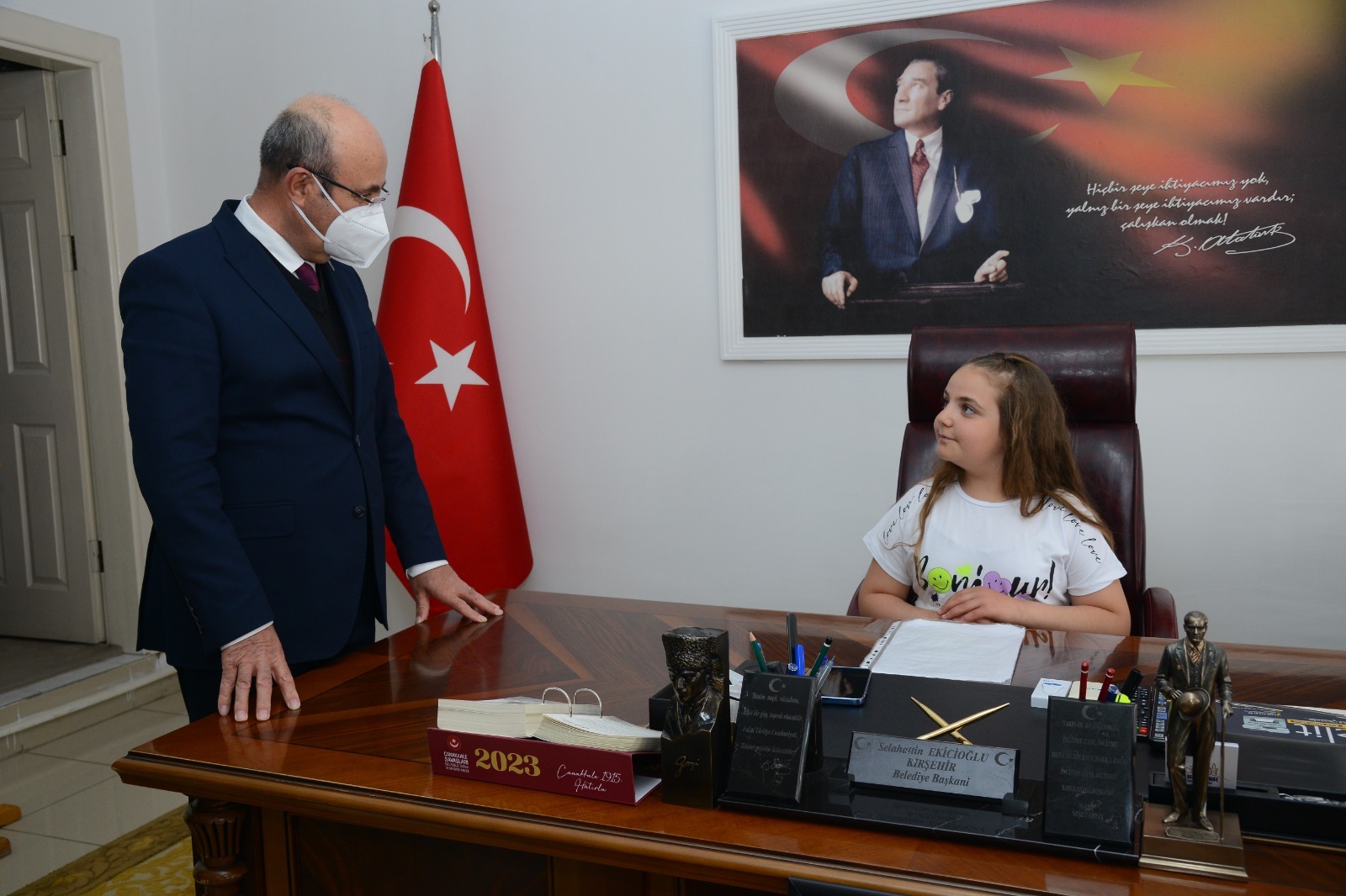 23 Nisan 2023 Pazar günü saat 10.30’da, Ahi Evran İlkokulu’nun Belediye Başkanımız Selahattin Ekicioğlu’nu makam ziyaretinde okul müdürü Bekir Değer, öğretmeni Gülseren Köysüren ve 3. Sınıf öğrencilerimiz Cansu Gökgöz, Metin Köysüren, Ahmet Özalp, Yağmur Bahar Güler ve 4. Sınıf öğrencilerimiz Azranur Aslan ve Zehranur Ala ile Bayram sevinci yaşandı.
