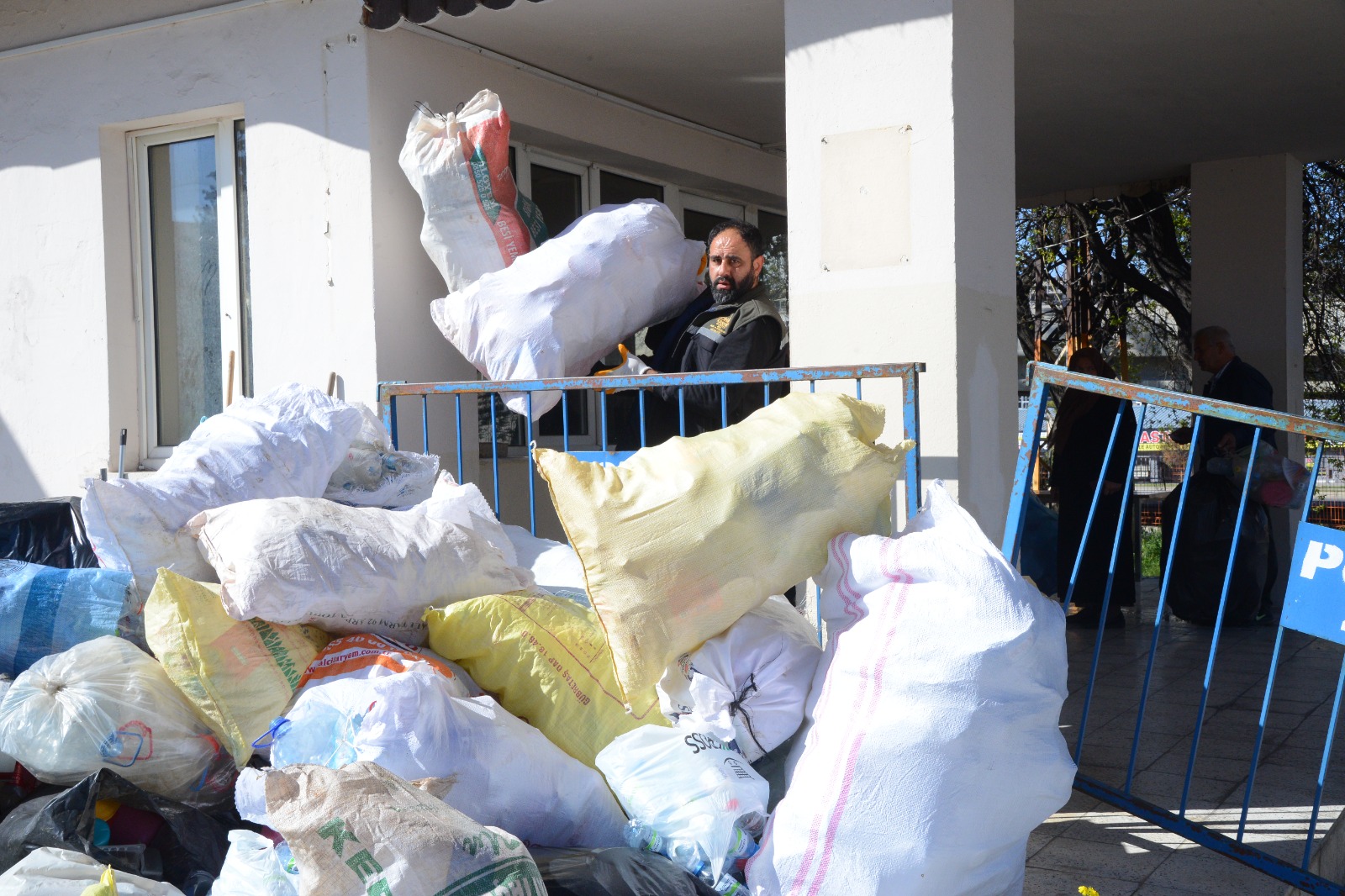 içinde 50 adet geri dönüşüm malzemesi (plastik, metal) getiren