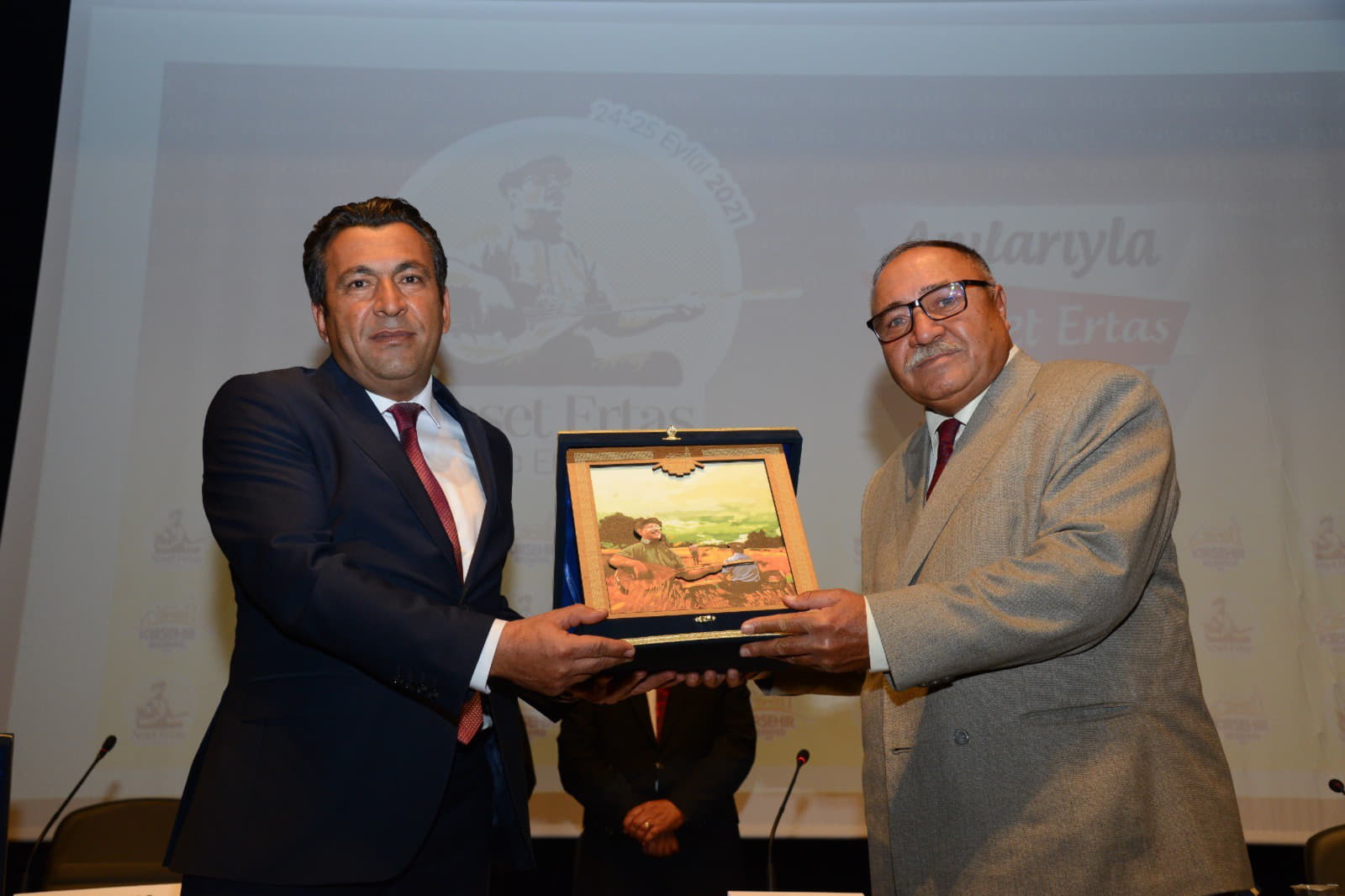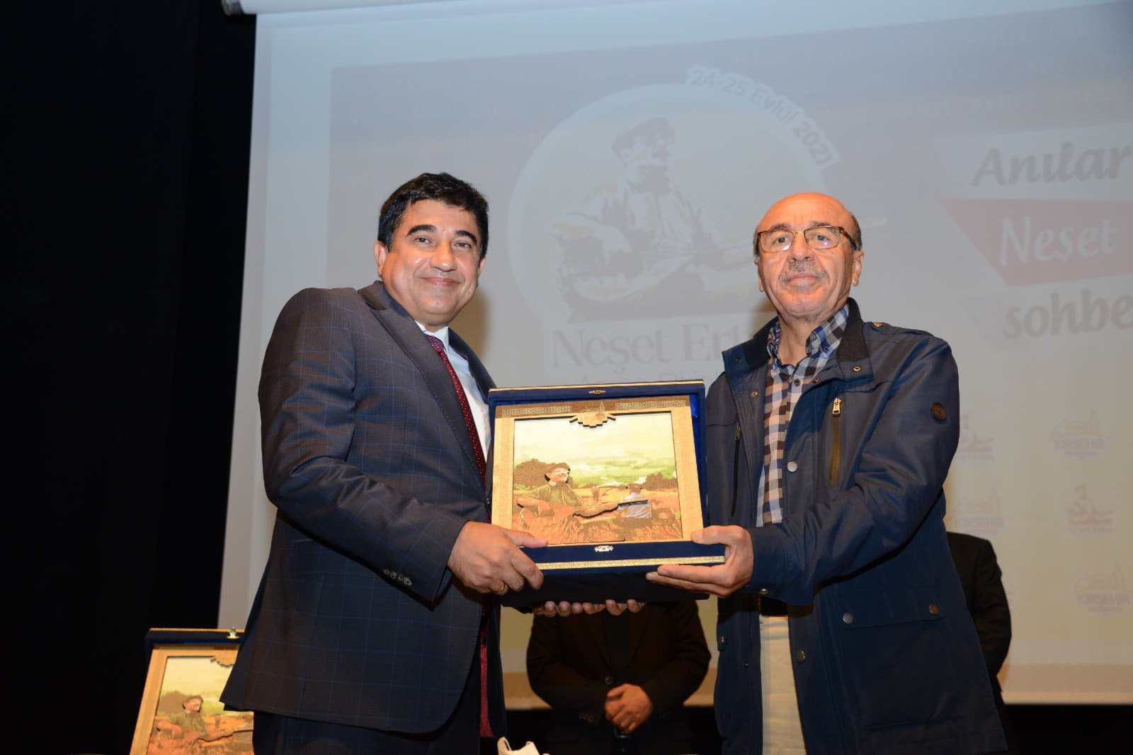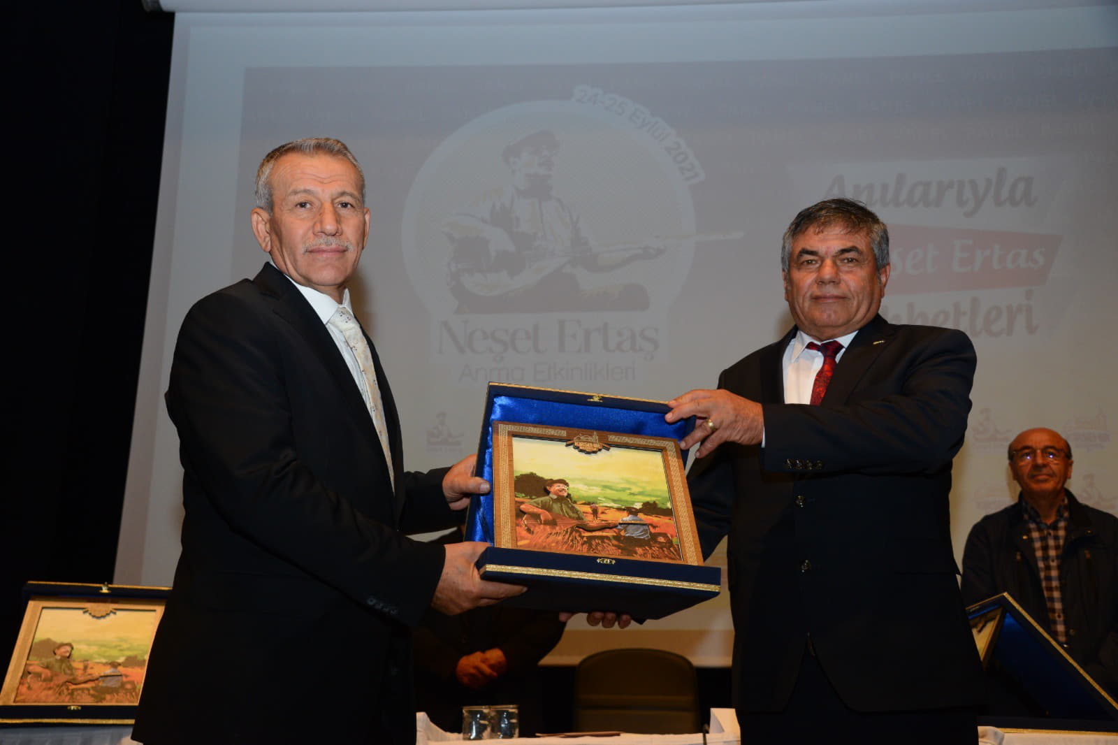 Ertaş adına Zafer Ertaş'a plaketini Hüseyin Ertaş takdim ederken, Vali İbrahim Akın tarafından Ayşe Tekin'e; Belediye