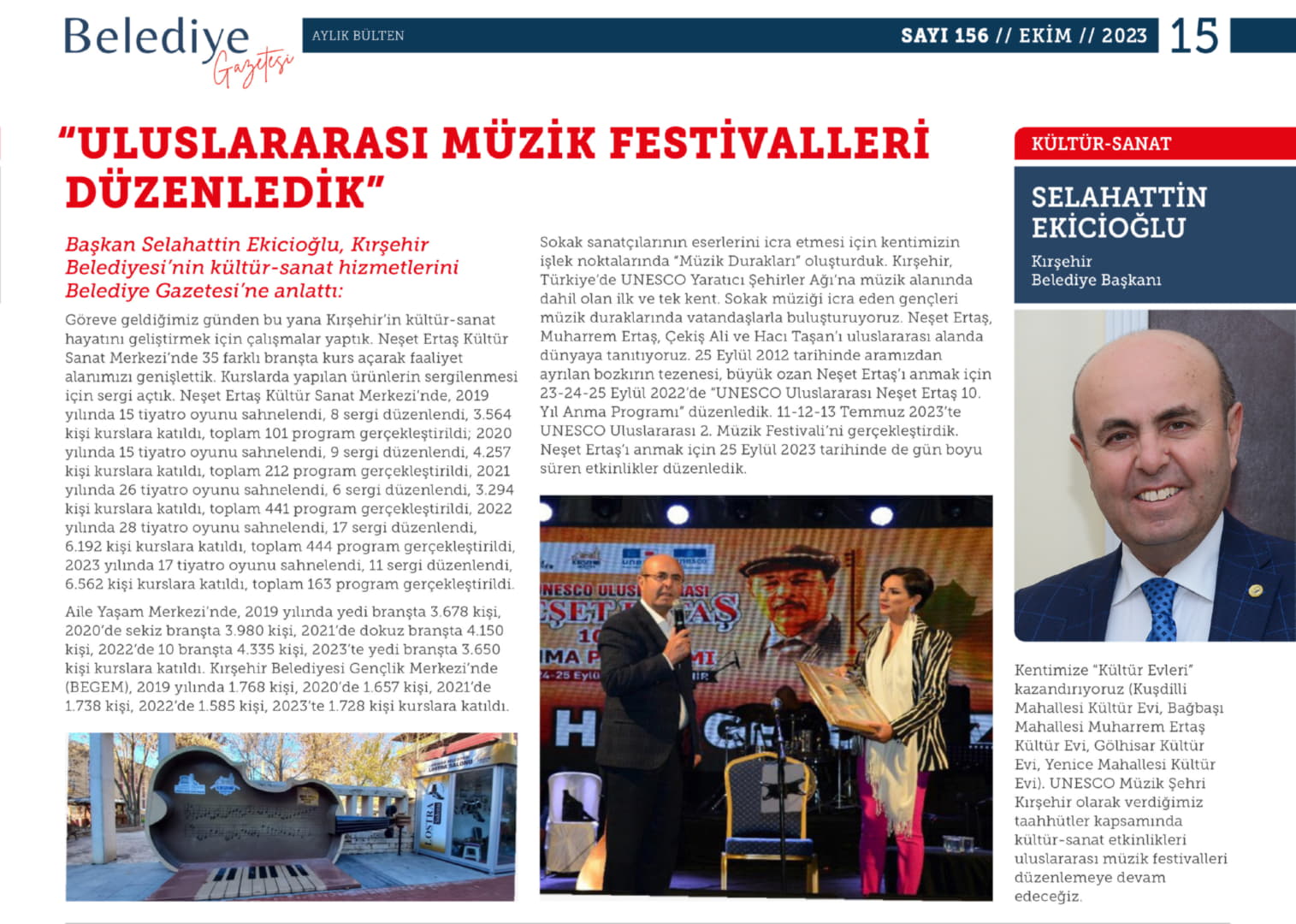 “Göreve geldiğimiz günden bu yana Kırşehir’in kültür-sanat hayatını geliştirmek için çalışmalar yaptık. Neşet Ertaş Kültür Sanat Merkezi’nde 35 farklı branşta kurs açarak faaliyet alanımızı genişlettik. Kurslarda yapılan ürünlerin sergilenmesi için sergi açtık. Neşet Ertaş Kültür Sanat Merkezi’nde, 2019 yılında 15 tiyatro oyunu sahnelendi, 8 sergi düzenlendi, 3.564 kişi kurslara katıldı, toplam 101 program gerçekleştirildi; 2020 yılında 15 tiyatro oyunu sahnelendi, 9 sergi düzenlendi, 4.257 kişi kurslara katıldı, toplam 212 program gerçekleştirildi, 2021 yılında 26 tiyatro oyunu sahnelendi, 6 sergi düzenlendi, 3.294 kişi kurslara katıldı, toplam 441 program gerçekleştirildi, 2022 yılında 28 tiyatro oyunu sahnelendi, 17 sergi düzenlendi, 6.192 kişi kurslara katıldı, toplam 444 program gerçekleştirildi, 2023 yılında 17 tiyatro oyunu sahnelendi, 11 sergi düzenlendi, 6.562 kişi kurslara katıldı, toplam 163 program gerçekleştirildi.