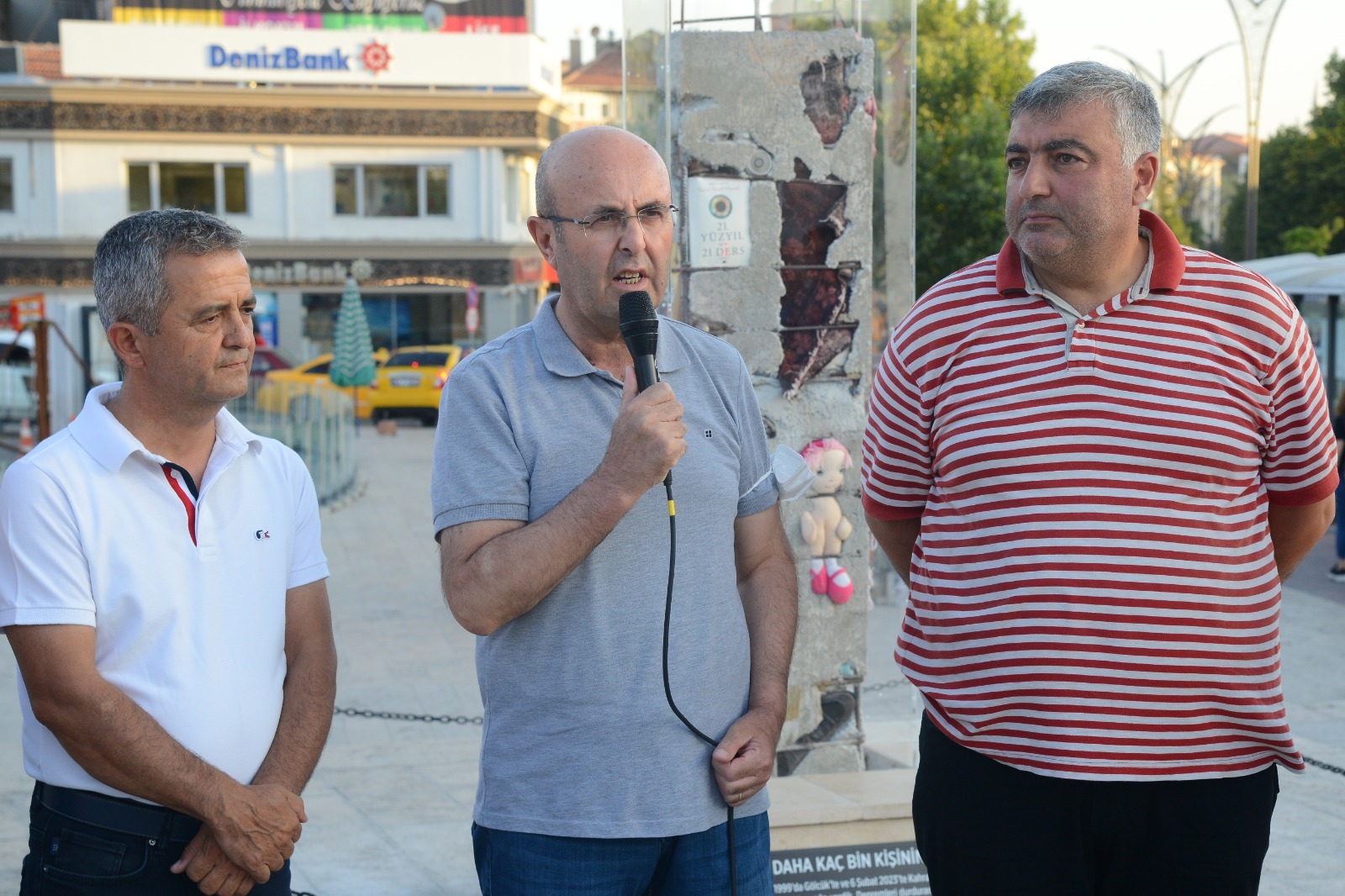 TMMOB Mimarlar Odası Ankara Şubesi Kırşehir Temsilcisi Mehmet Kurt ve TMMOB İnşaat Mühendisleri Odası Ankara Şubesi Kırşehir Temsilci Yardımcısı Ali Atik2in konuşmalarının ardından söz alan Başkanımız Ekicioğlu “On binlerce insanımızın hayatını kaybettiği 1999 ve 2023 yılında meydana gelen büyük depremler, yüreğimizde onulmaz yaralar bıraktı. Yaşadığımız acılara rağmen bir türlü ders çıkarmadık ve benzer hataları yapmaya devam ettik. Kırşehir Belediyesi, depreme karşı bilinci ve farkındalığı arttırarak bu acı gerçeği insanlara hatırlatmak adına Cacabey Meydanı'na Sanatçı kardeşimiz Sercan Bayram tarafından tasarlanan ''Deprem Anıtı'' yerleştirdik.” dedi.