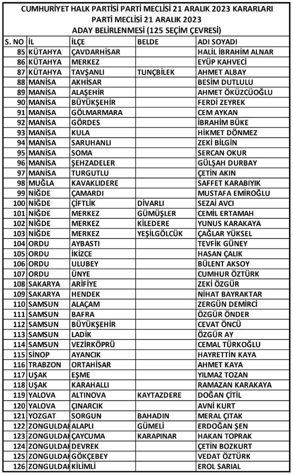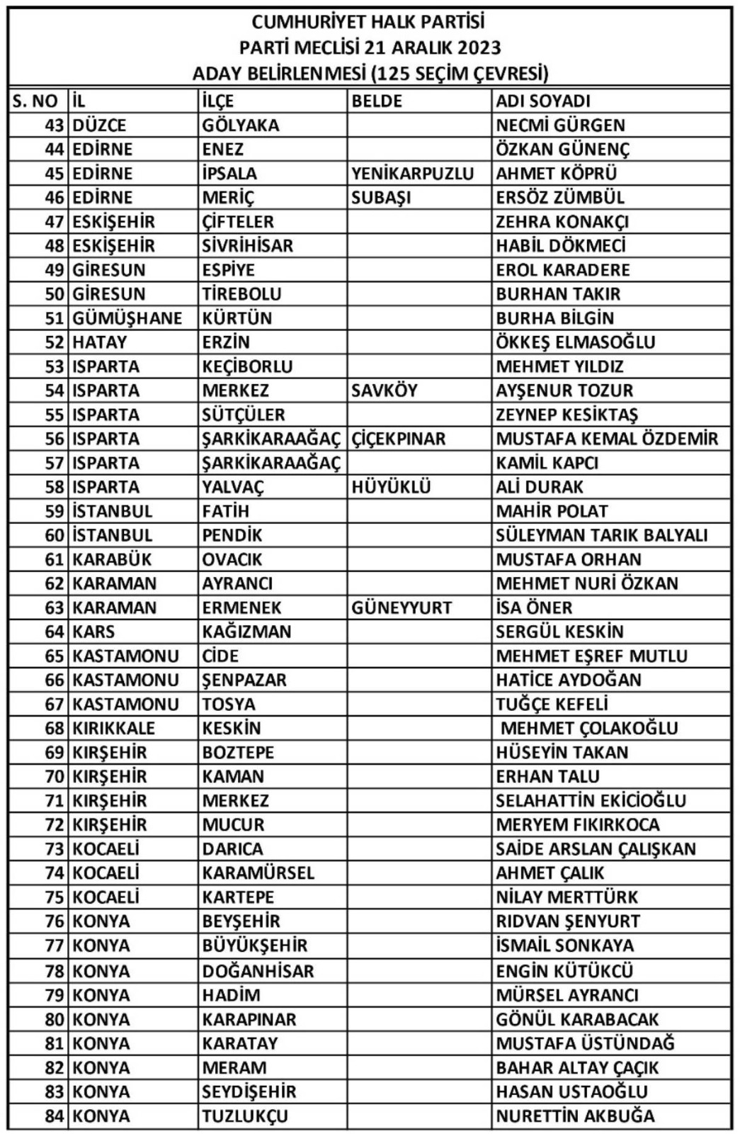 21 Aralık 2023 tarihinde CHP MYK'sinin aldığı kararın PM'de oylanmasının ardından bazı seçim bölgesinin adayları açıklandı.