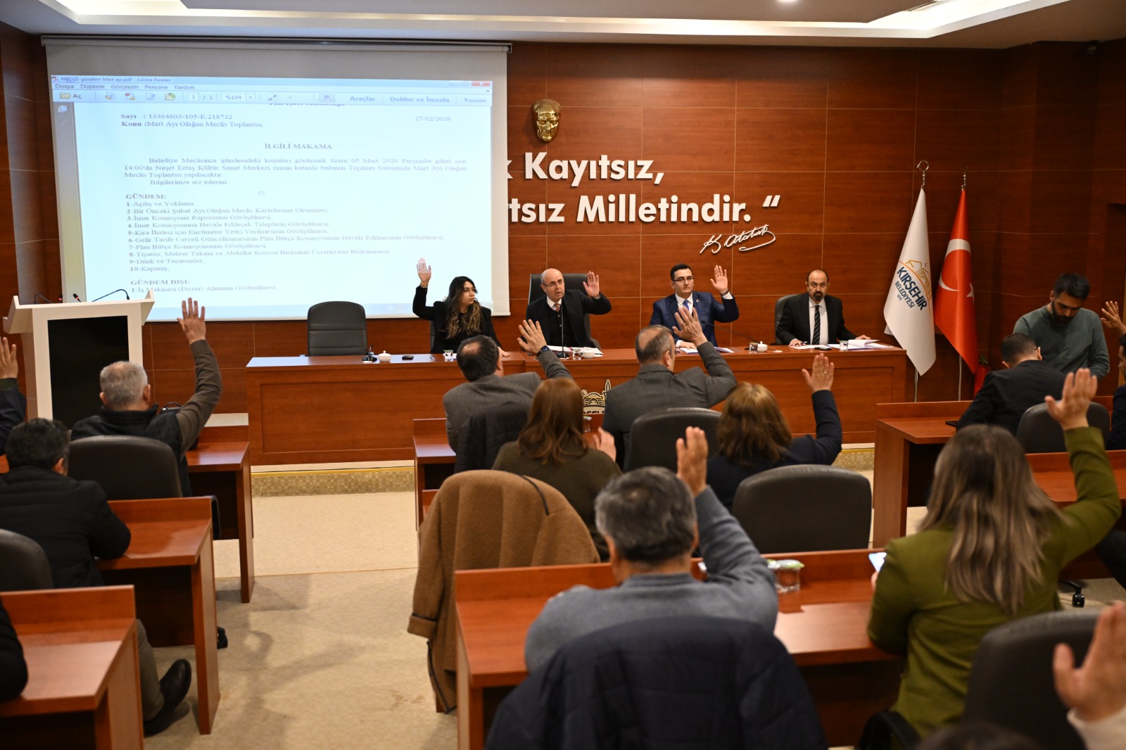 Belediye Başkanımız Selahattin Ekicioğlu'nun yönettiği Mart Ayı Olağan Meclis Toplantısı toplantısında sırasıyla; Bir Önceki Şubat Ayı Olağan Meclis Kararlarının Okunması, İmar Komisyonu Raporunun Görüş, İmar Komisyonuna Havale Edilecek Taleplerin Görüş, Kira İhalesi için Encümene Yetki Verilmesinin Görüş, Gelir Tarife Cetveli Güncellenmesinin Plan Bütçe Komisyonuna Havale Edilmesinin Görüşülmesi, Plan Bütçe Komisyonunun Görüşülmesi ile Tiyatro, Mehter Takımının verilmesi ve Abdallar Korosu Biriminin ücretlerinin belirlenmesi.