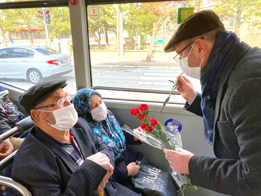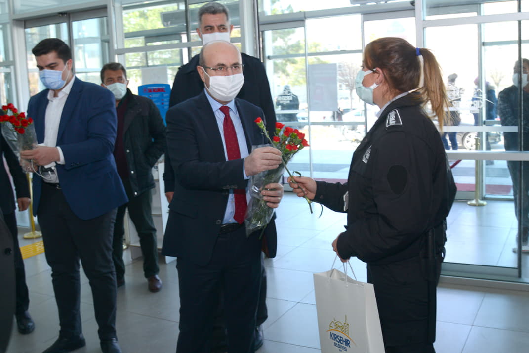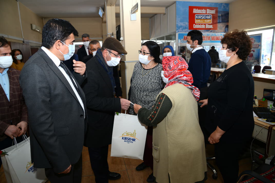 çalışan kadınları birimlerinde ziyaret edip çeşitli hediyeler vererek 8 Mart