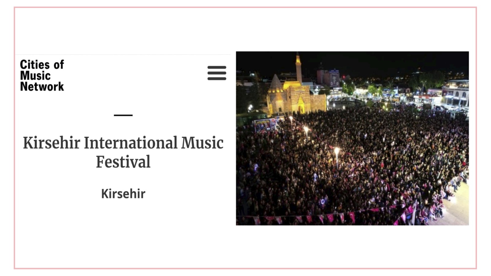 https://citiesofmusic.net/kirsehir-international-music-festival/ linkinde yer alan haberde Kırşehir Belediyesi tarafından organize edilen ve yoğun bir katılımla gerçekleştirilen UNESCO Uluslararası 2. Müzik Festivali ile ilgili olarak şunlar ifade edildi: