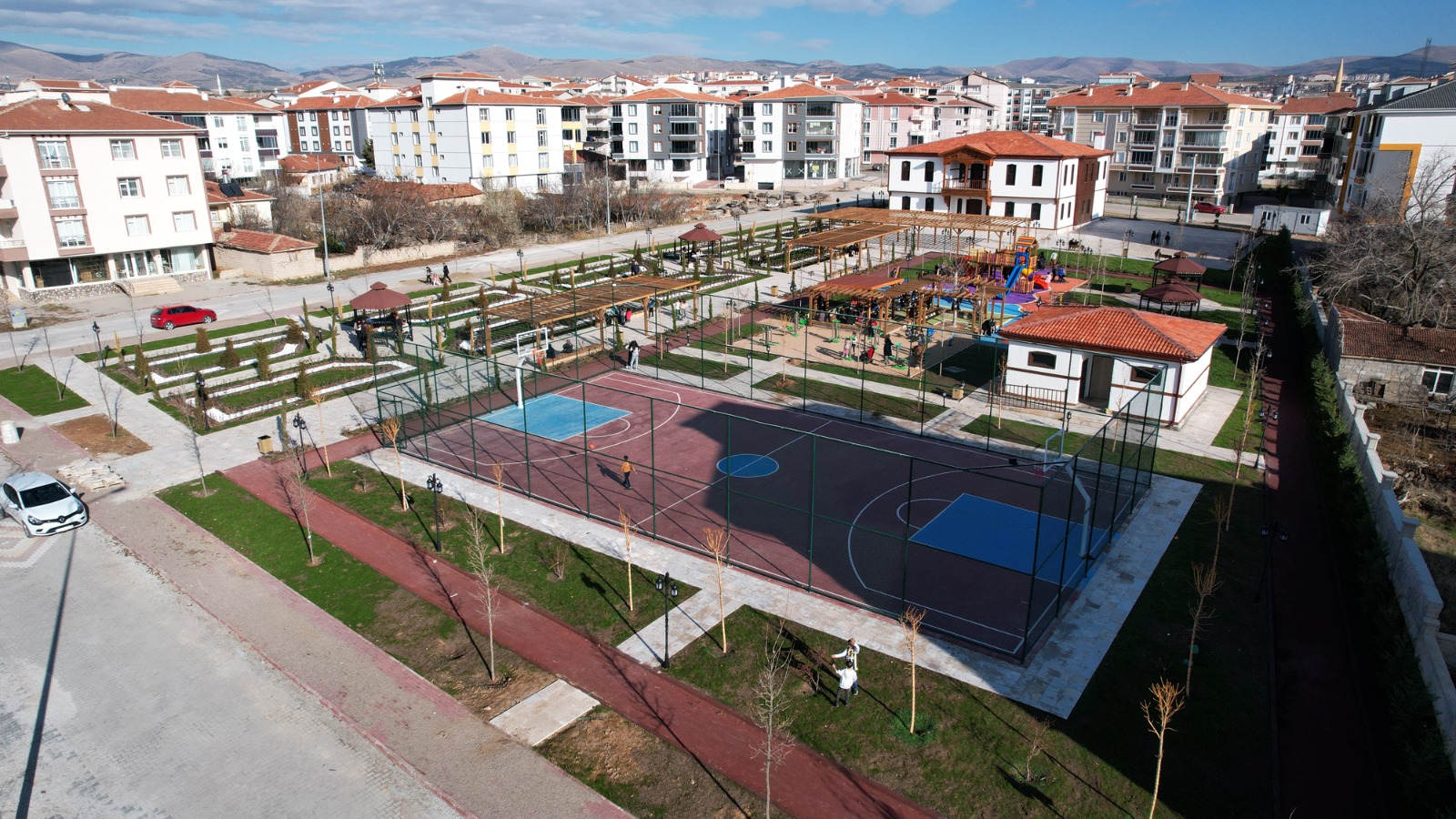 Çocuk oyun alanı, fitness alanı, kum havuzu ve basket sahası ile alanın tüm
